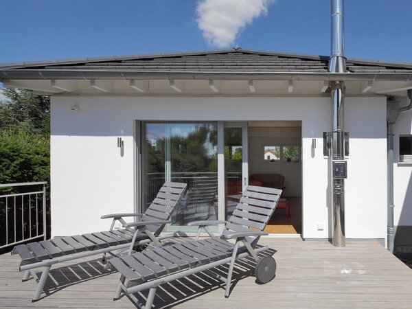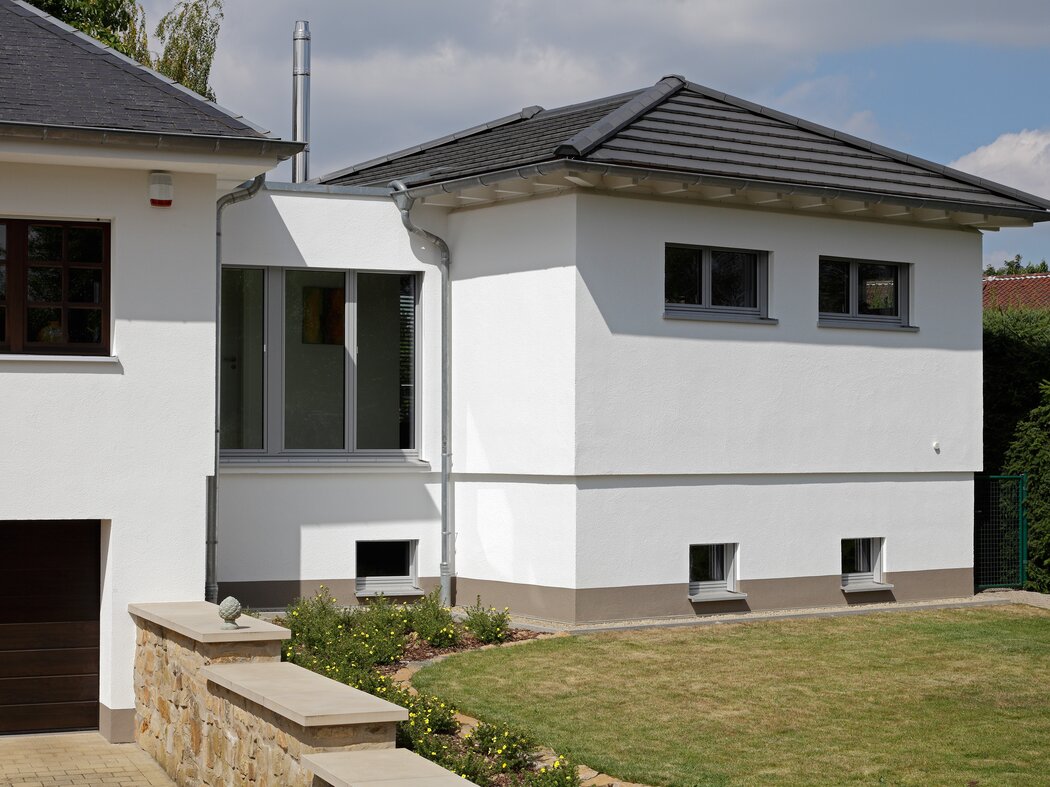 "Der kleine Anbau ist eine optische Fortsetzung des Hauses mit Mineralputz und toskanischem Zeltdach mit grauen Dachziegeln. Läuft man vom Haus über den Holzboden des Verbindungsflurs – vorbei am Gäste-WC – durch das gemütliche Wohnzimmer mit integriertem Ofen, erreicht man das Highlight: die Terrasse mit Blick auf den Garten. Der schlichte Anbau erweitert das Haus Amhofer nicht nur um mediterranes Flair und einen hellen Wohnbereich, sondern plant auch ausreichend Stauraum mit ein: Zwei separate Kellerräume bieten endlich den lang ersehnten Platz im Haus."