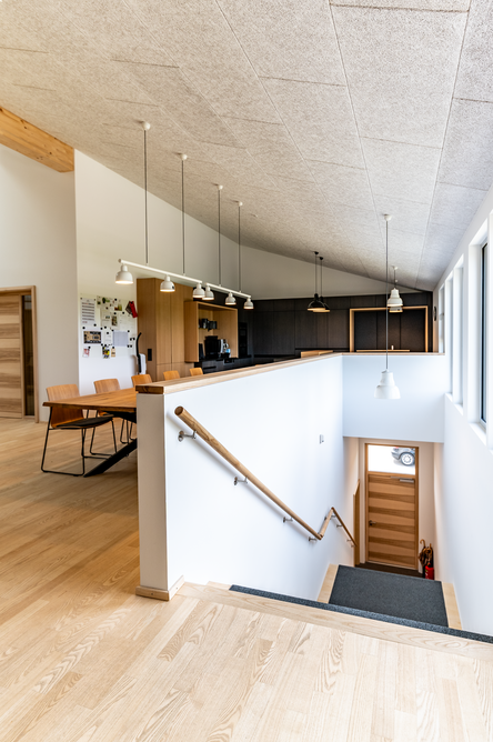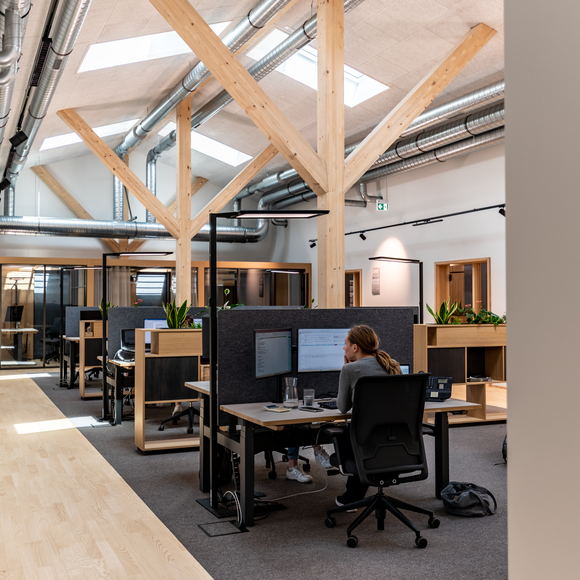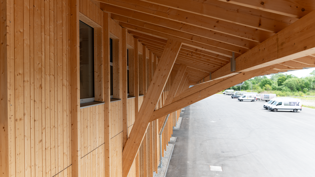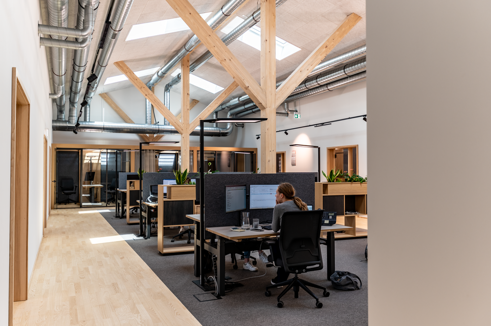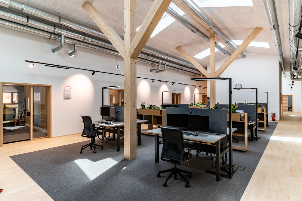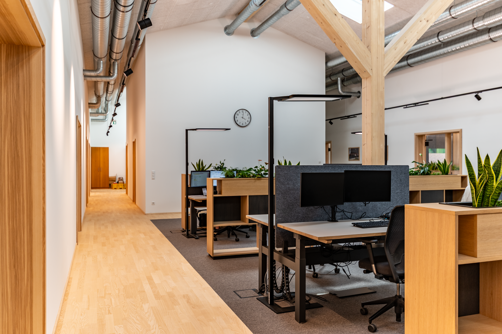 90 x 20 Meter umfasst der zweigeschossige Objektbau auf dem Gelände von Baufritz am Unternehmenssitz in Erkheim. Hier sind das Kommissionslager unserer Manufaktur sowie Büros und Besprechungsräume untergebracht. Eingezogen sind unsere Montageleitung, Arbeitsvorbereitung, Projektleiter und Service. Bis auf das Fundament besteht das Gebäude zu nahezu 100 % aus Holz. Im Kommissionslager bereiten wir die Materialien für unsere Monteure vor, die sie beim Bau unserer Häuser benötigen. Verkürzte Kommissionierzeiten, optimierte Prozesse und eine fehlerfreie Auftragszusammenstellung, das war das Ziel. Durch die Größe der Halle haben wir ausreichend Raum und genügend Kapazität, alle Materialien passend zur Größe und dem Umfang unserer Bauvorhaben einzulagern. Dank der optimalen Anordnung der präzise vorgefertigten Waren haben wir eine effiziente Raumnutzung erreicht. Die Waren sind für unser Team in Regalsystemen eingelagert, mit kurzen Laufwegen für ein schnelles und einfaches Picking. Speziell ausgewählte Tore, Fußbodenheizung und unsere wirkungsvoll ökologisch isolierten Außenwände mit dem Baufritz-Wandaufbau ermöglichen unseren Lagerbeschäftigten auch im Winter einen nachhaltigen und vorbildlichen Betrieb. Und: Wir haben auch für unsere Belegschaft an den Schreibtischen helle Räume mit spürbarer Aufenthaltsqualität für angenehmes Arbeiten geschaffen.
