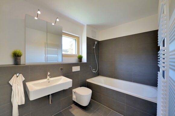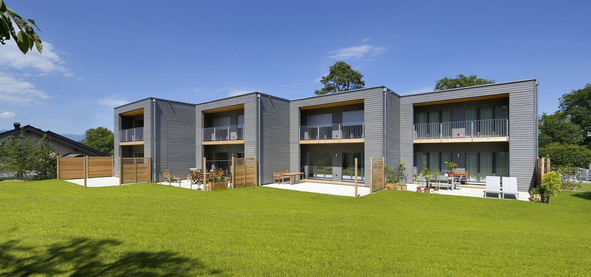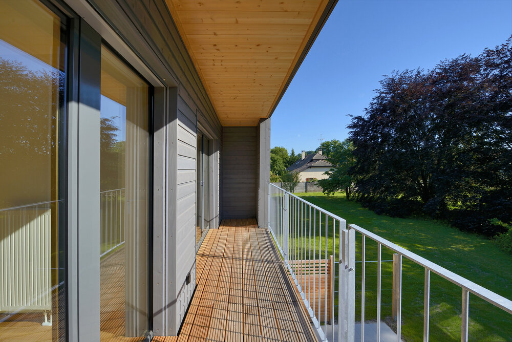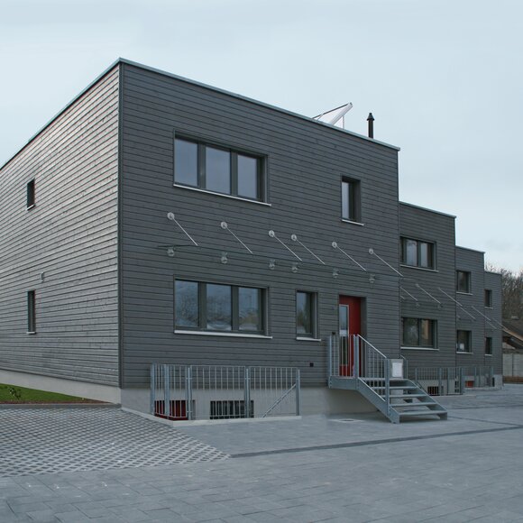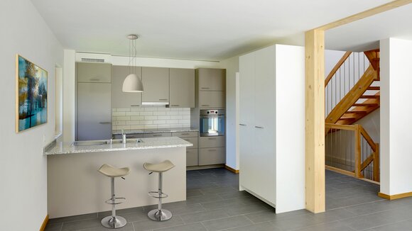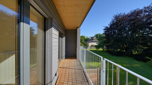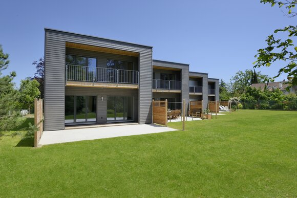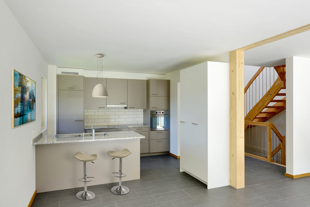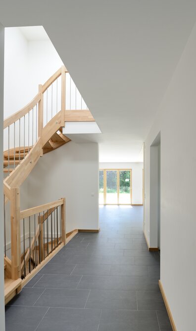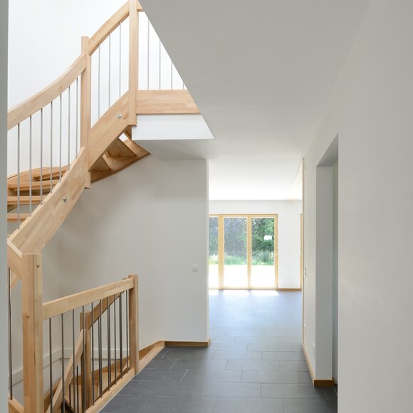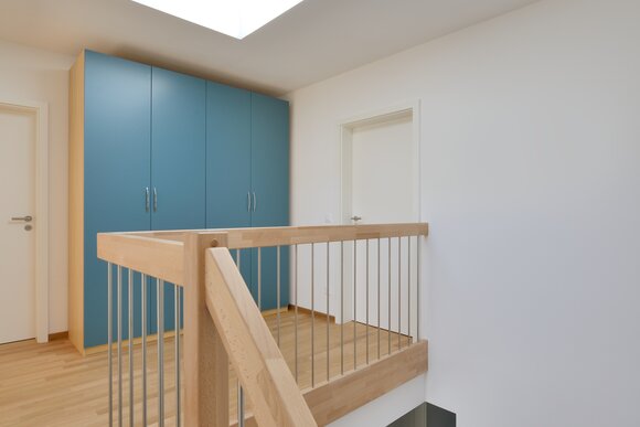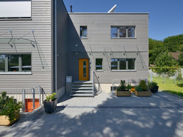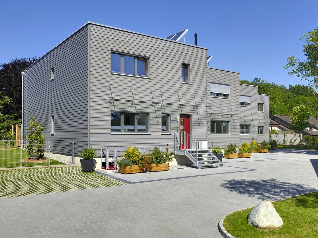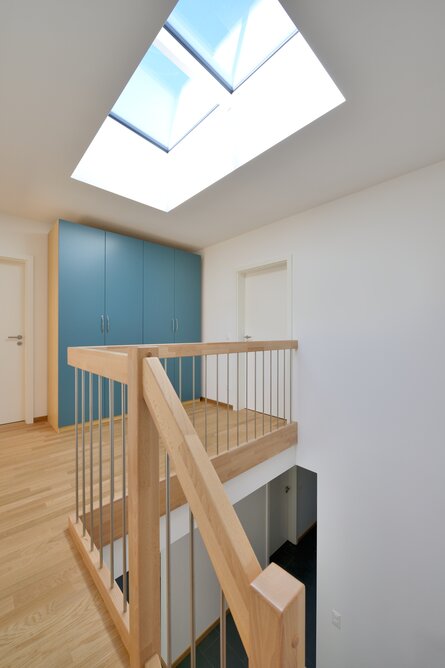 Als Kapitalanlage geplant, eröffnet das Mehrfamilienhaus mit seinen vier Kuben insbesondere Familien ausreichend Lebensraum. Wohngesundheit, ökologische Bauweise und familienbudget-schonende Maßnahmen, was die Energieeffizienz betrifft – das waren entscheidende Kriterien für den Investor, sich für die Expertise von Baufritz zu entscheiden. Zudem spielten die hohe Qualität und individuelle Planung, für die Baufritz bekannt ist, eine große Rolle. Gestalterisch wurde die umgebende Natur in die Planung einbezogen. Während sich die vier Kuben zur Straße hin freundlich zurückhaltend geben, öffnen sie sich nach hinten mit einer nahezu komplett verglasten Hausfront und beziehen den Außenraum in das Wohnerlebnis mit ein. Der als offener Grundriss umgesetzte Wohn-, Ess- und Kochbereich ist durch eine bodentiefe Glastürenfront von Terrasse und Garten abgetrennt. Räume im Obergeschoss, die als Kinder- oder Gäste-Zimmer genutzt werden, teilen sich den großen überdachten Balkon über der Terrasse. Für sehr viel natürlichen Lichteinfall sorgt ein großes Dachfenster über der Treppe im Hausinnern.