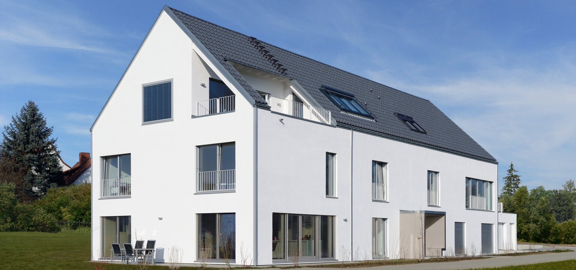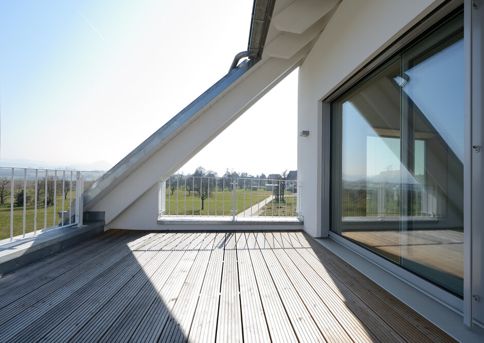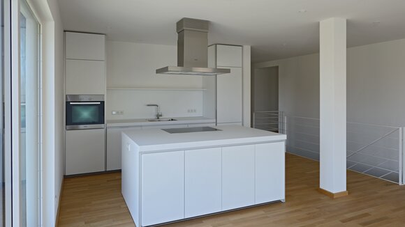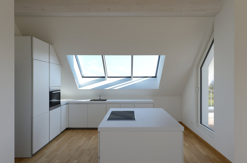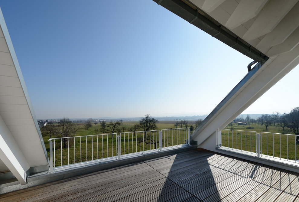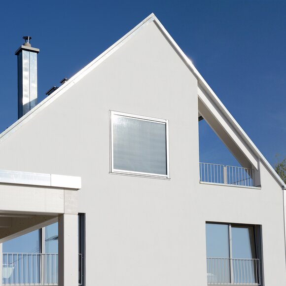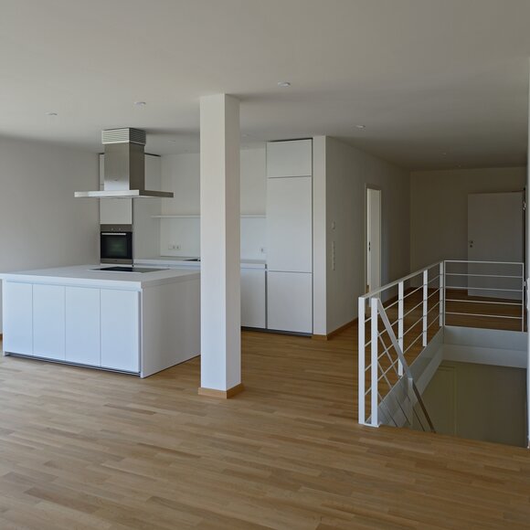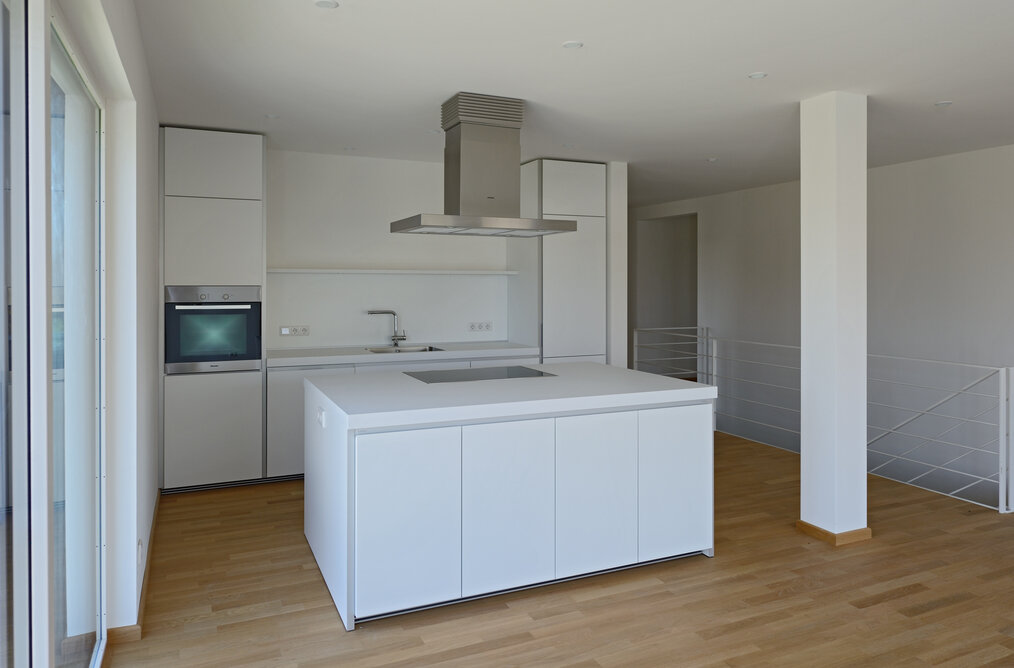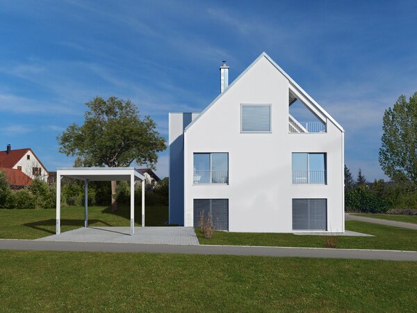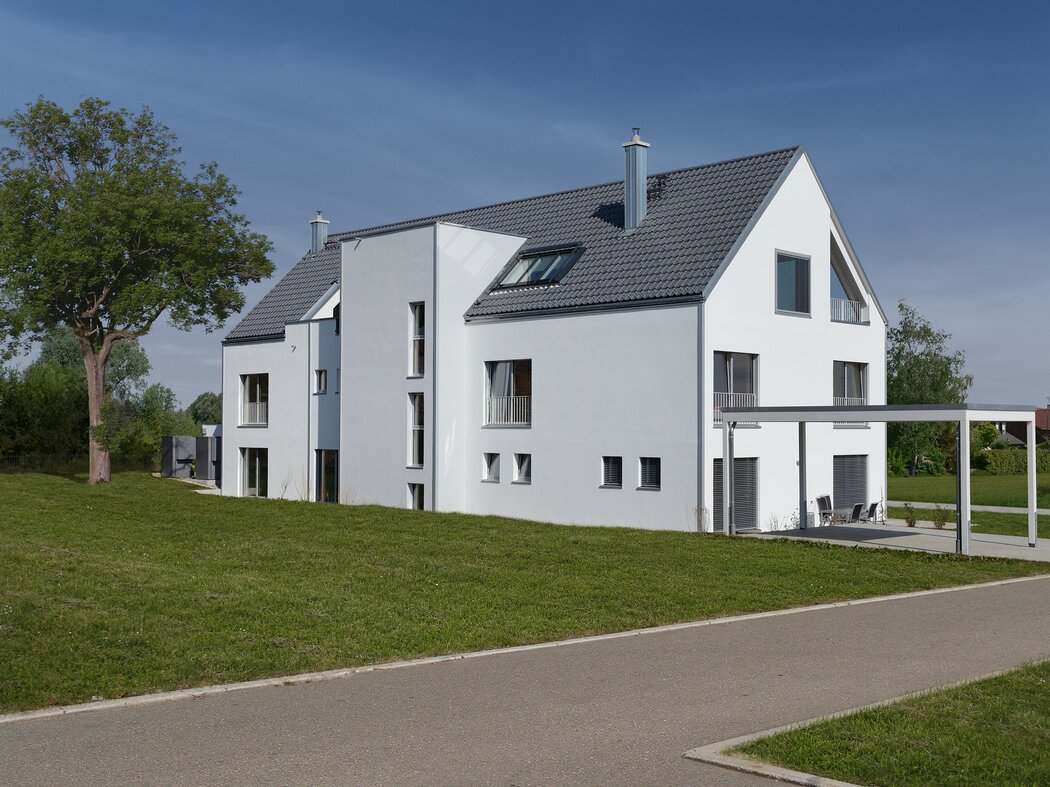 Das Konzept „Drei Häuser in einem“ verfolgt den Gedanken, zu gegebener Zeit als Eigenheim genutzt zu werden und zuvor Mieteinnahmen zu erwirtschaften – auf dieser Basis wurde das Projekt Schindele geplant. Entstanden sind zwei Doppelhaus-Hälften mit einem Dachgeschoss darüber. Auch so kann ein Mehrfamilienhaus aussehen. Die Doppelhaushälften verfügen über jeweils zwei Kinderzimmer. Kochen, Essen, Wohnen bzw. Schlafen findet auf vertauschten Ebenen statt. Dadurch lässt sich die Aussicht nutzen – und Privatsphäre wahren. Terrassen gibt es im Erdgeschoss, Balkone oben. Und die Wohnung im Dachgeschoss hat zwei blickgeschützte Dachterrassen. Die Ausstattung des gesamten Hauses ist so hochwertig, wie die Besitzer es sich fürs eigene Wohngefühl gewünscht haben. Ein Aufzug, weitsichtig altersgerecht geplant, verbindet die barrierefreien Etagen und ergänzt das große, helle Treppenhaus. Die kluge Raumaufteilung in drei voneinander getrennten Einheiten, mit voneinander unabhängiger Energieversorgung. ermöglicht eine problemlose Nutzung des gesamten Hauses als Mehrgenerationen-Objekt.