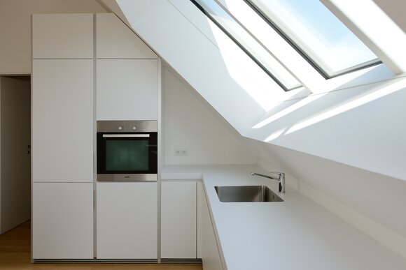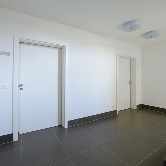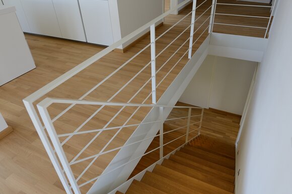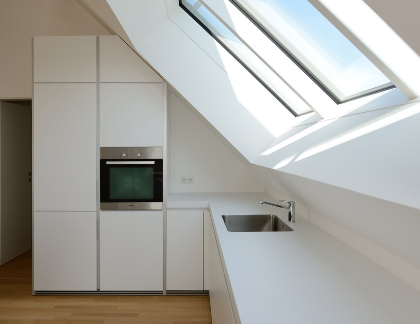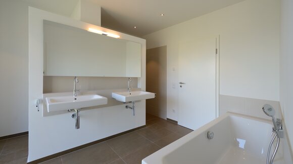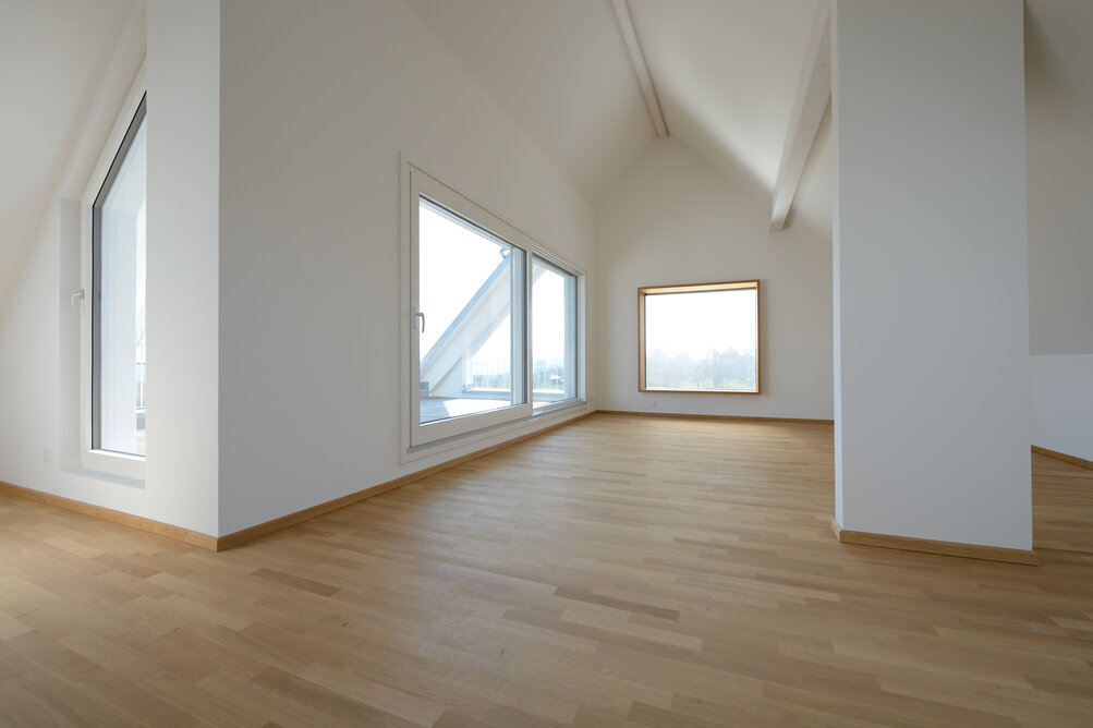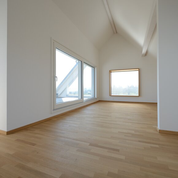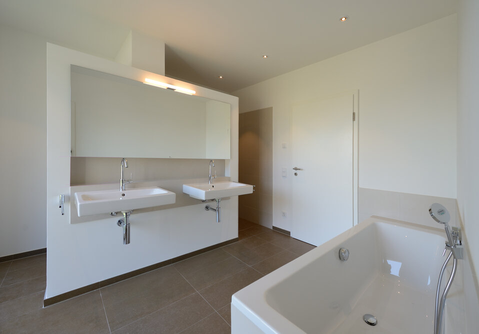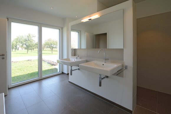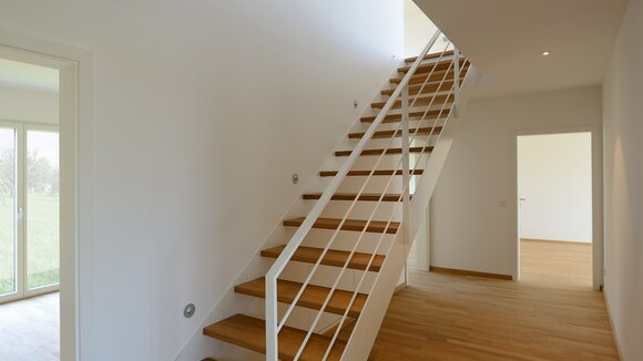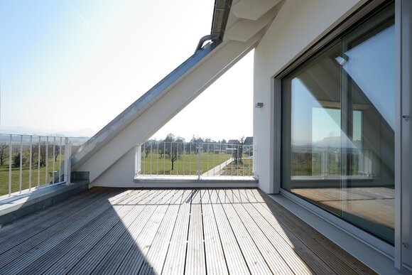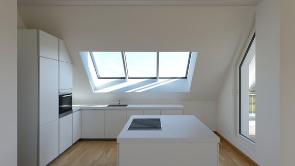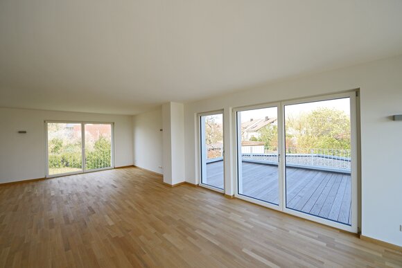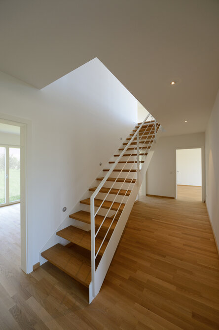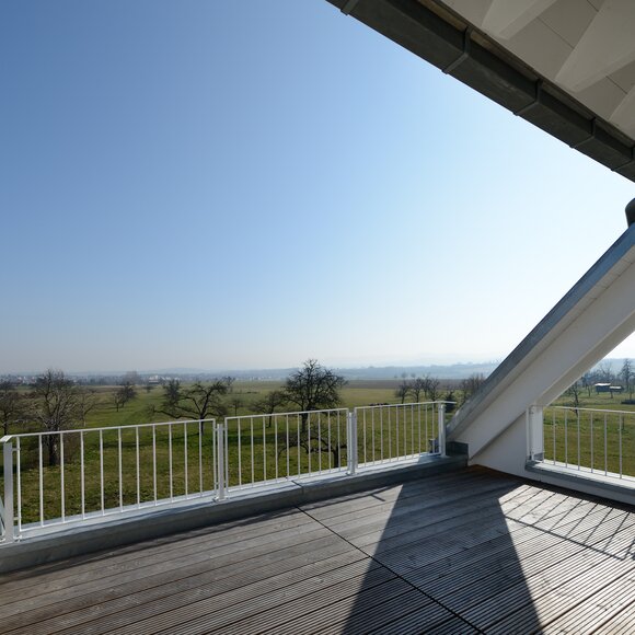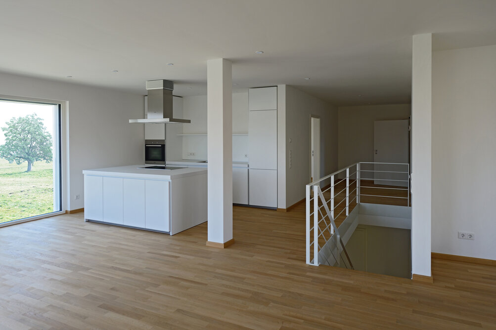 Das Konzept „Drei Häuser in einem“ verfolgt den Gedanken, zu gegebener Zeit als Eigenheim genutzt zu werden und zuvor Mieteinnahmen zu erwirtschaften – auf dieser Basis wurde das Projekt Schindele geplant. Entstanden sind zwei Doppelhaus-Hälften mit einem Dachgeschoss darüber. Auch so kann ein Mehrfamilienhaus aussehen. Die Doppelhaushälften verfügen über jeweils zwei Kinderzimmer. Kochen, Essen, Wohnen bzw. Schlafen findet auf vertauschten Ebenen statt. Dadurch lässt sich die Aussicht nutzen – und Privatsphäre wahren. Terrassen gibt es im Erdgeschoss, Balkone oben. Und die Wohnung im Dachgeschoss hat zwei blickgeschützte Dachterrassen. Die Ausstattung des gesamten Hauses ist so hochwertig, wie die Besitzer es sich fürs eigene Wohngefühl gewünscht haben. Ein Aufzug, weitsichtig altersgerecht geplant, verbindet die barrierefreien Etagen und ergänzt das große, helle Treppenhaus. Die kluge Raumaufteilung in drei voneinander getrennten Einheiten, mit voneinander unabhängiger Energieversorgung. ermöglicht eine problemlose Nutzung des gesamten Hauses als Mehrgenerationen-Objekt.