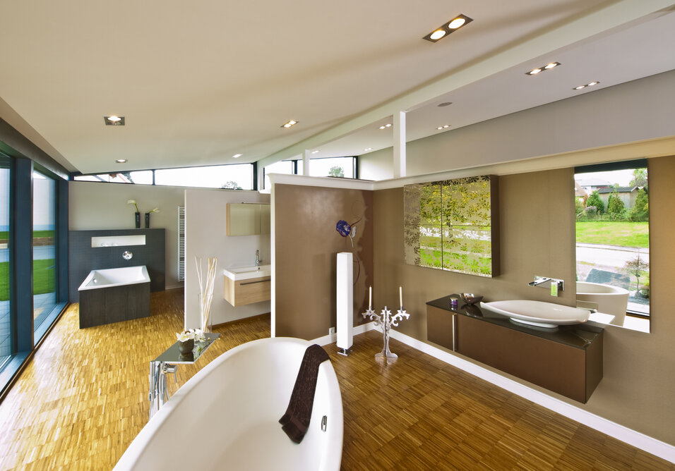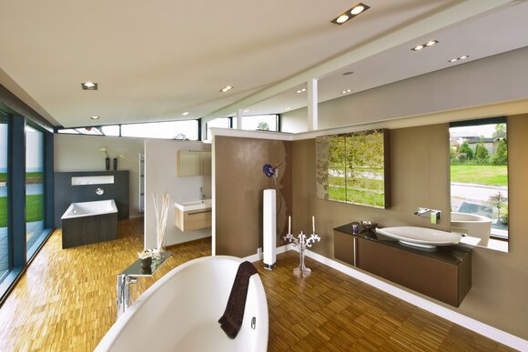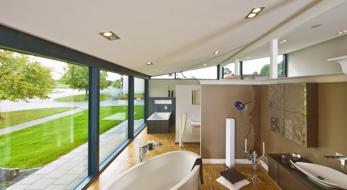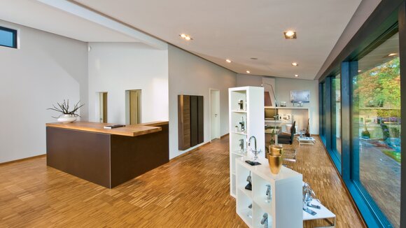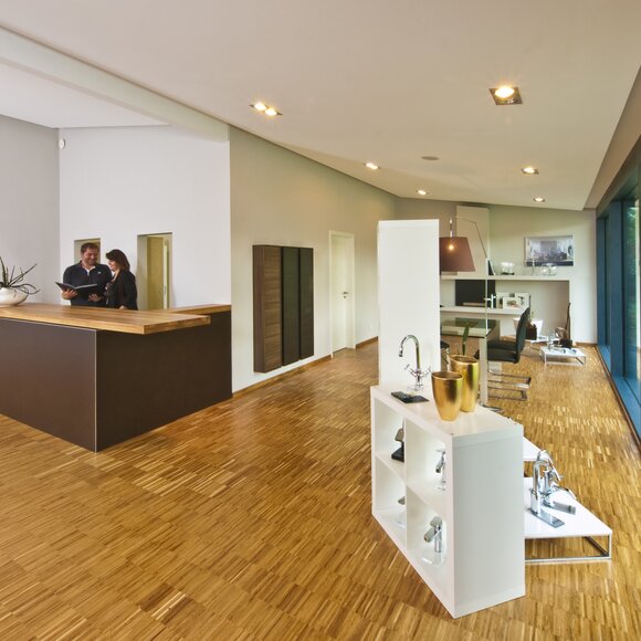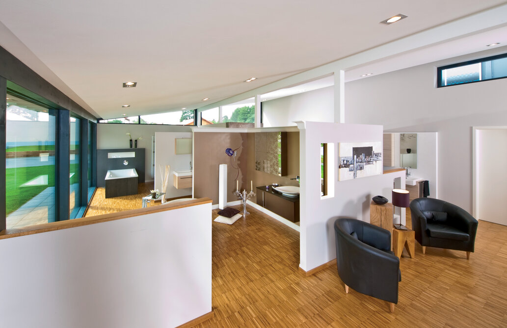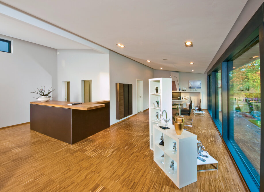 „Wir sind seit Jahren mit dem Unternehmen in Kontakt, planen gerade auch wieder eine hochwertige weitere Ausstellung. Es lag nahe, die schnelle Montage, individuelle Planung und Vorfertigung für den Neubau zu nutzen. Außerdem wollten die Bauherren eine besondere Atmosphäre, gerade im Kundenbereich erzielen, abseits von üblichen Sanitärausstellungen mit Industriecharakter. Im Grunde war die Idee, eine Gestaltung zu bekommen, wie sie auch in der HausSchneiderei zu finden ist - anders, einladend, wohnlich, durchaus auch gehobener.“