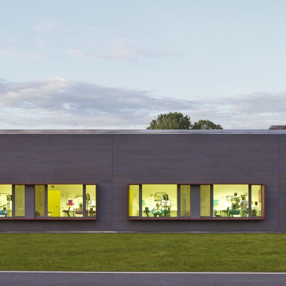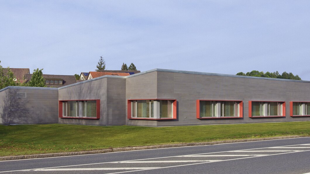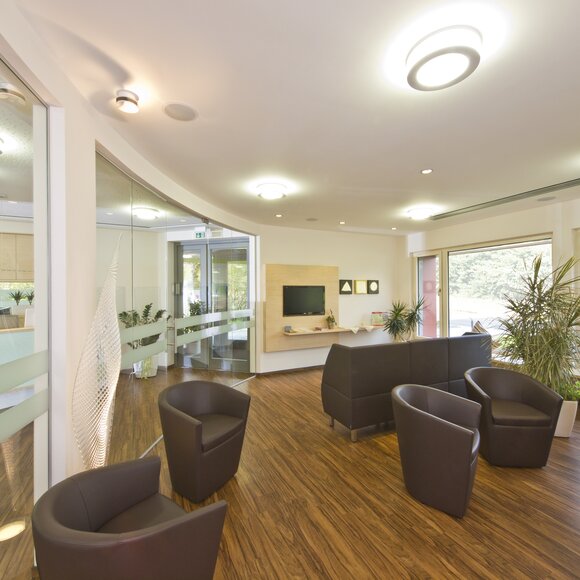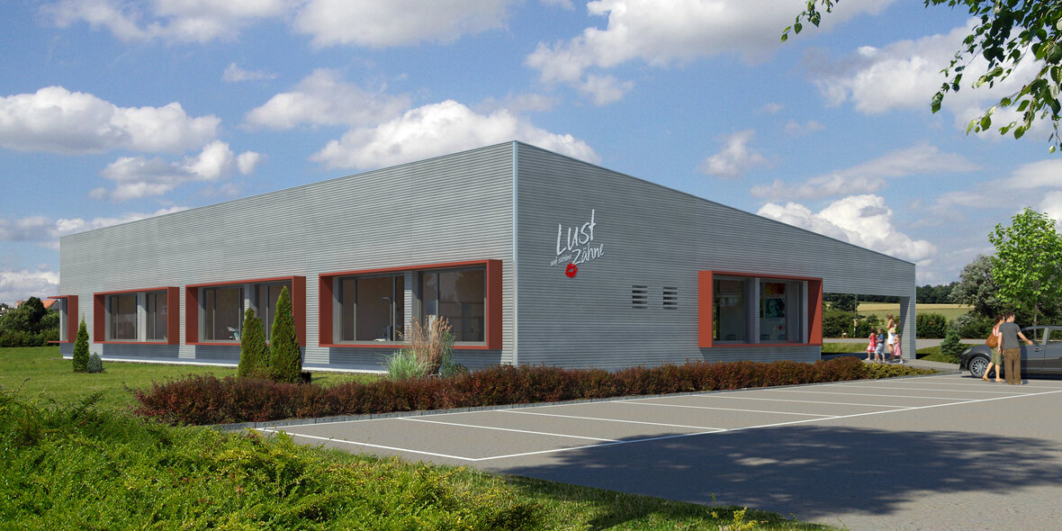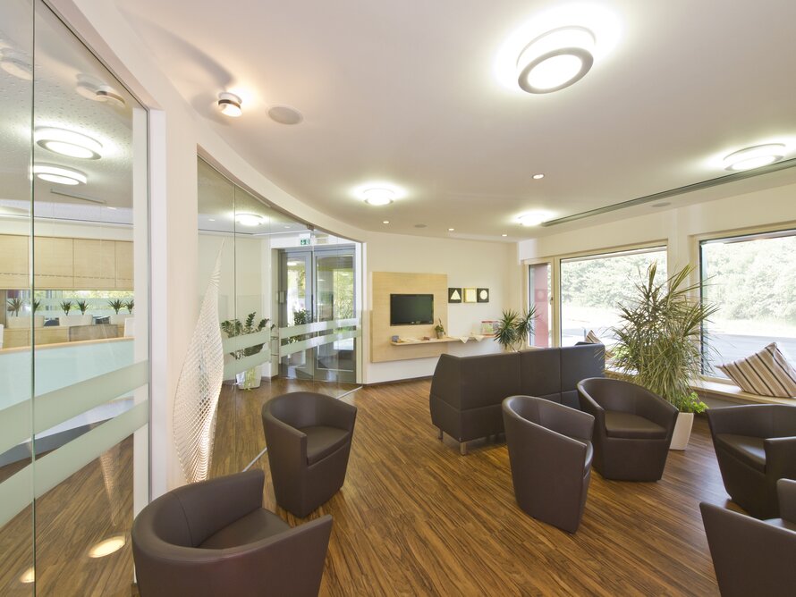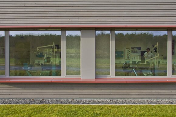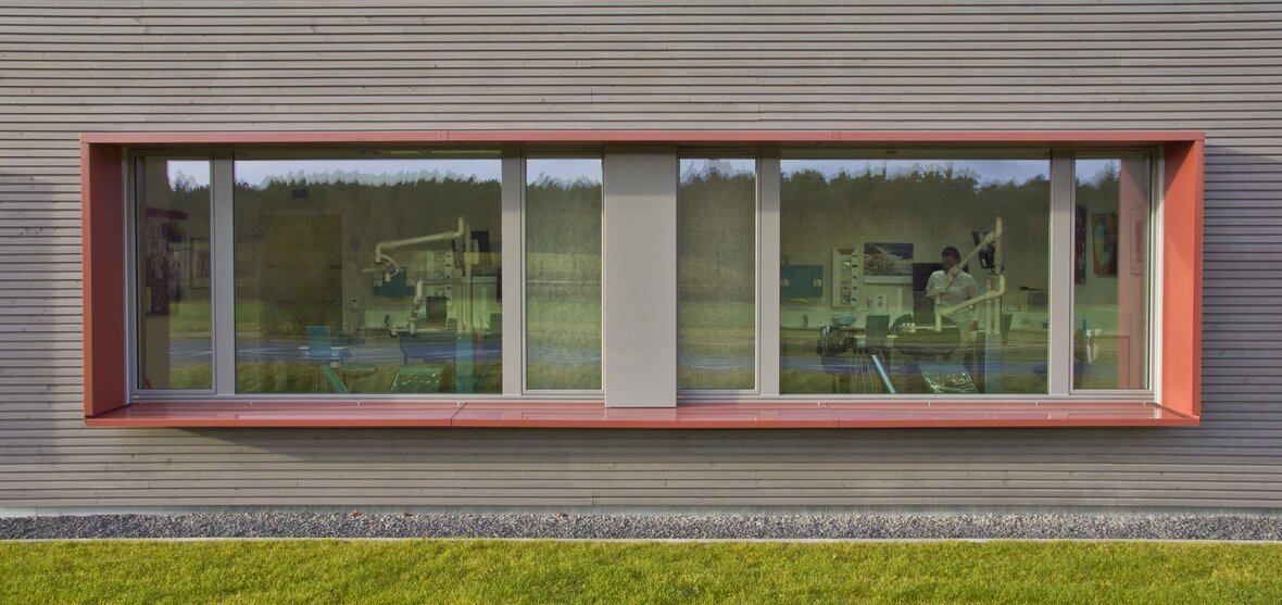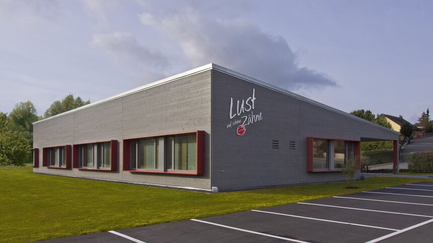 Zahngesundheit in einer gesunden Umgebung, mit diesem schönen Anspruch kam die Praxis auf Baufritz zu. Entstanden ist ein einladender Bungalow mit schlichter, sachlicher Kubatur und klaren Linien unter Pultdach und ohne Dachüberstand. Die wartungsfreie Holzverschalung mit Vergrauungslasur nimmt den natürlichen Vergrauungsprozess des Holzes auf optisch ansprechende Weise vorweg. So klar die Architektur sich von außen zeigt, so einladend ist die Atmosphäre in den Räumen, angefangen beim Empfang der Patienten. Sie betreten das Entree geschützt durch einen überdachten Eingang. Die Behandlungsräume sind angenehm hell und freundlich, der Wartebereich mit den organischen Formen erinnert an eine entspannte Lounge. Viel Tageslicht und natürliche Materialien schaffen eine beruhigende und vertrauenswürdige Umgebung