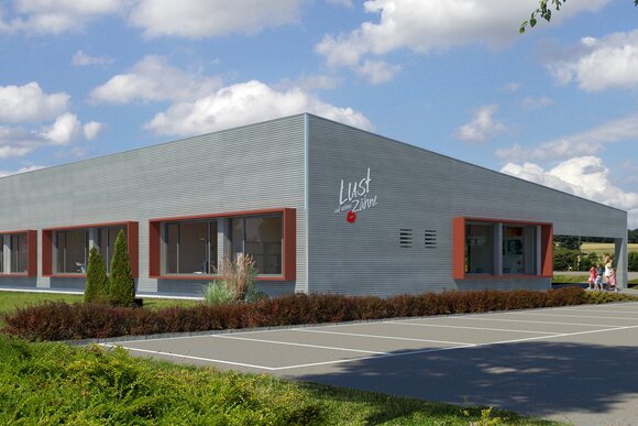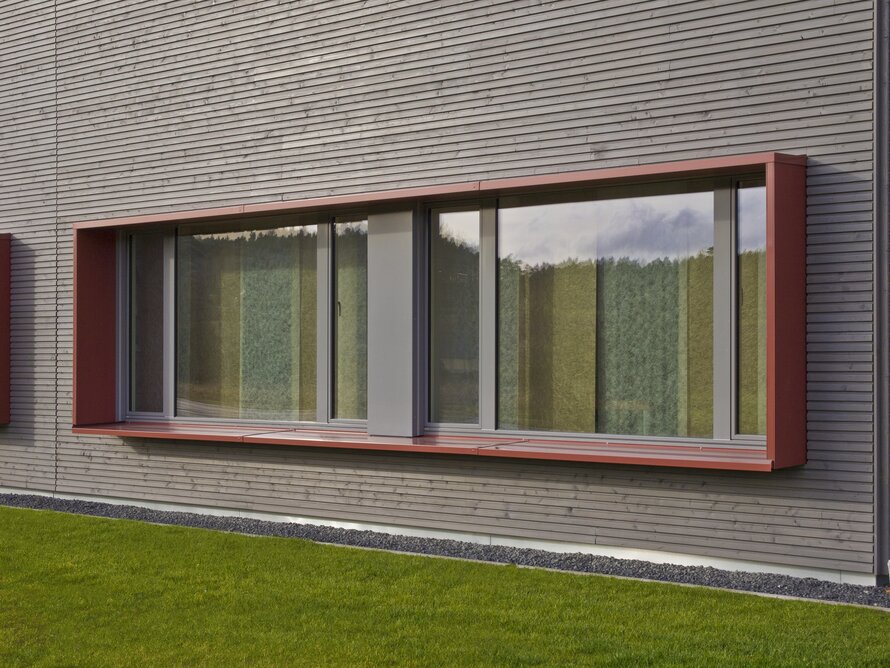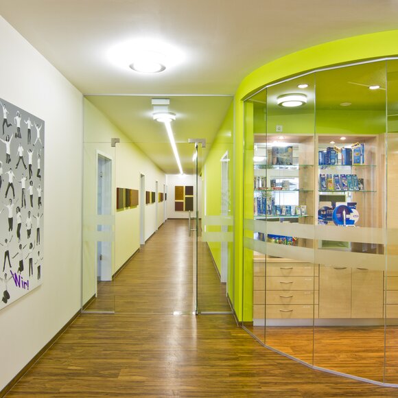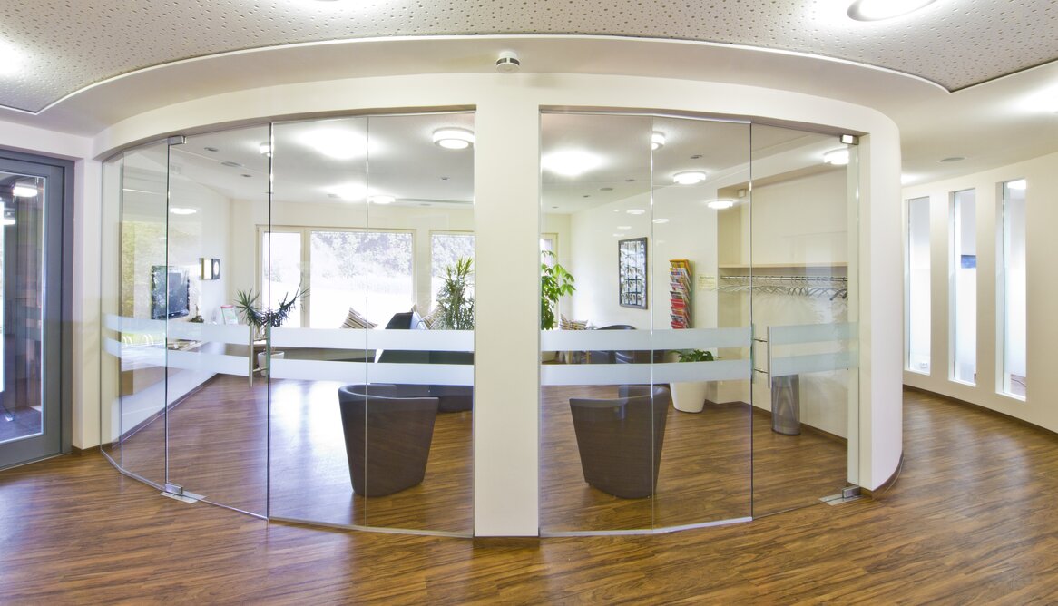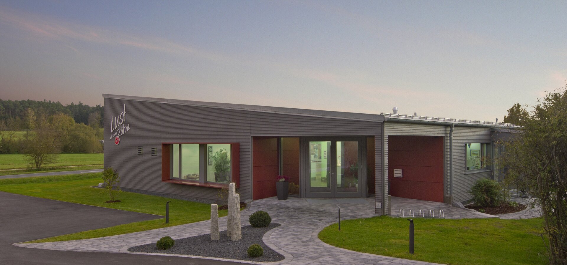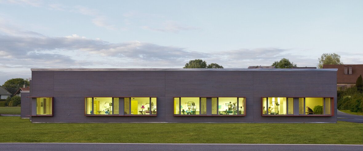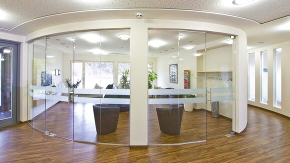 Zahngesundheit in einer gesunden Umgebung, mit diesem schönen Anspruch kam die Praxis auf Baufritz zu. Entstanden ist ein einladender Bungalow mit schlichter, sachlicher Kubatur und klaren Linien unter Pultdach und ohne Dachüberstand. Die wartungsfreie Holzverschalung mit Vergrauungslasur nimmt den natürlichen Vergrauungsprozess des Holzes auf optisch ansprechende Weise vorweg. So klar die Architektur sich von außen zeigt, so einladend ist die Atmosphäre in den Räumen, angefangen beim Empfang der Patienten. Sie betreten das Entree geschützt durch einen überdachten Eingang. Die Behandlungsräume sind angenehm hell und freundlich, der Wartebereich mit den organischen Formen erinnert an eine entspannte Lounge. Viel Tageslicht und natürliche Materialien schaffen eine beruhigende und vertrauenswürdige Umgebung