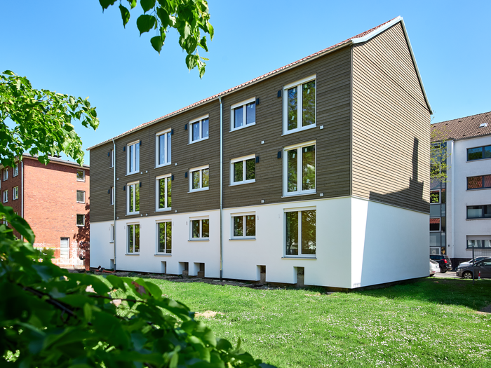 So kann klimafreundliche Quartierssanierung heute aussehen: Mit vorgefertigten Wandelementen, innovativer Technik und ganzheitlichem Nachhaltigkeitsanspruch wurde aus einem lang leerstehenden Gebäude ein zukunftsfähiges Zuhause für mehrere Parteien.