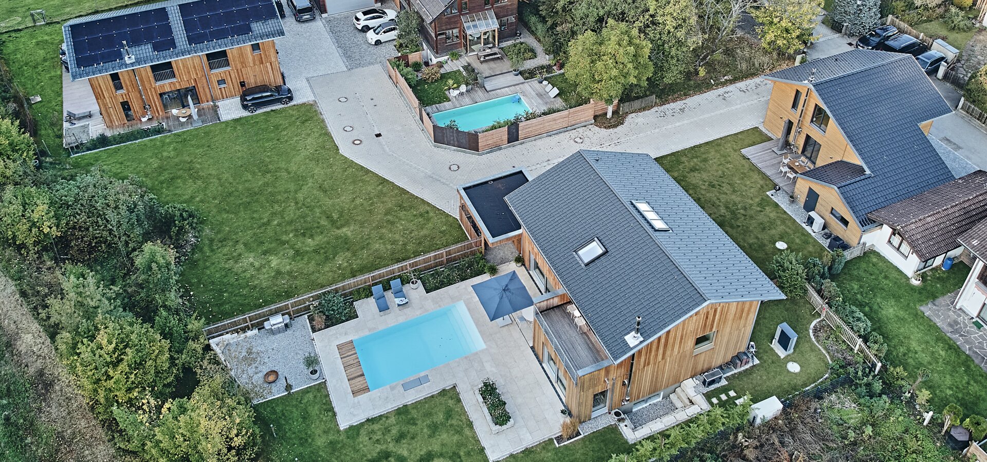 Gemeinschaftlich bauen und gut nachbarschaftlich leben: In Leutkirch im Allgäu hat die Bauherrengruppe um einen Architekten den ehemaligen Marienhof in ein außergewöhnliches Wohnquartier mit sieben Häusern verwandelt. Nachempfunden den früheren bäuerlichen Gebäuden, wurde dennoch die Individualität der heutigen Bewohner gewahrt. Für die Konstruktion der Holzhäuser wandte man sich an Baufritz, neben den Gebäudehüllen inklusive Fenstern, Sonnenschutz und Geschossdecken auch für die Fassade verantwortlich.