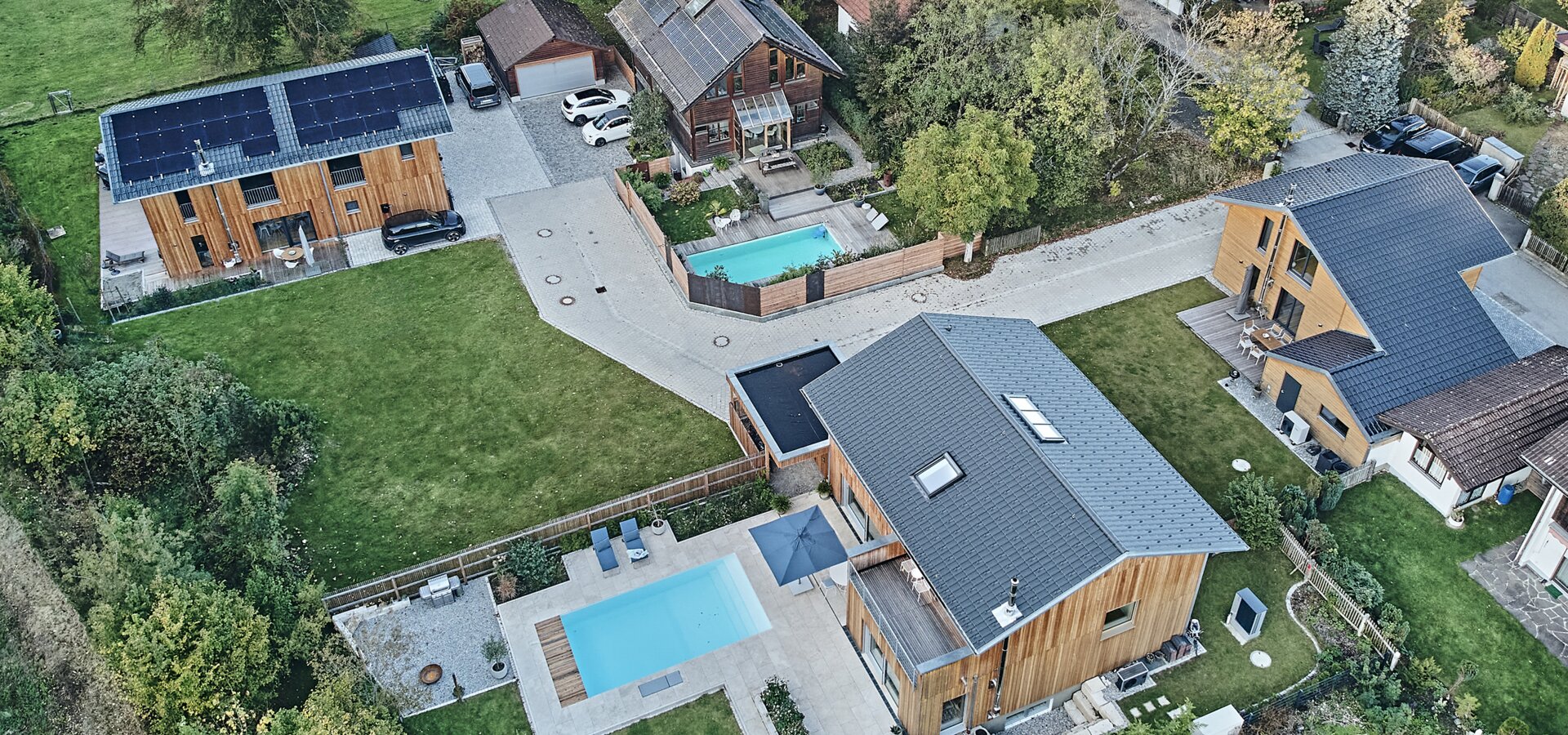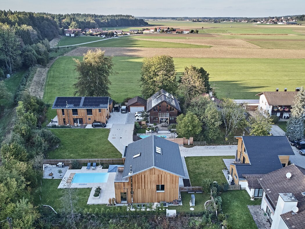 Da steht ein Grundstück in begehrter Lage zum Verkauf, hieß es. Am Wald gelegen, mitten auf dem Land und dabei nahe München. Julie und Benjamin Titz wohnten zu diesem Zeitpunkt bereits in einem Baufritz-Haus, sehr zufrieden – aber nun mit Aussicht auf ihr Traumgrundstück. Es war allerdings viel zu groß. Glücklicherweise konnten sie auch Marcus Ullrich und Familie Müller-Arnold von ihrem Vorhaben überzeugen. Hinsichtlich der Grundstücksteilung wurde man sich schnell einig. Und einig war man sich auch hinsichtlich der Zusammenarbeit mit Baufritz. Entscheiden sich alle Parteien für ein Material, hier Holz, und dazu noch einen Baupartner, ist das Erscheinungsbild naturgegeben stimmig. Dennoch hat jeder seinen Rückzugsort. Weil das gesamte Grundstück von Baufritz bebaut wurde, konnten die Sichtachsen berücksichtigt werden, um Privatsphäre zu generieren. Obwohl die Häuser Titz und Ullrich beide die Ausrichtung nach Süden haben, sind die Lebensbereiche auf unterschiedlichen Seiten der Häuser angelegt. Und unter Berücksichtigung des Ensembles der beiden Nachbarhäuser ließ sich bei Haus Titz der Erker-Anbau am Wohnzimmer mit der Dachterrasse so verschieben, dass sie uneinsehbar wurde. Das ist sicher ein Vorteil der Planung aus einer Hand.