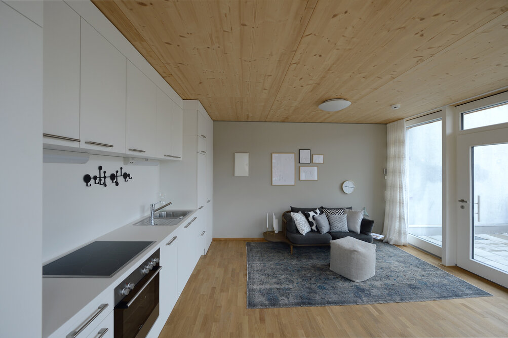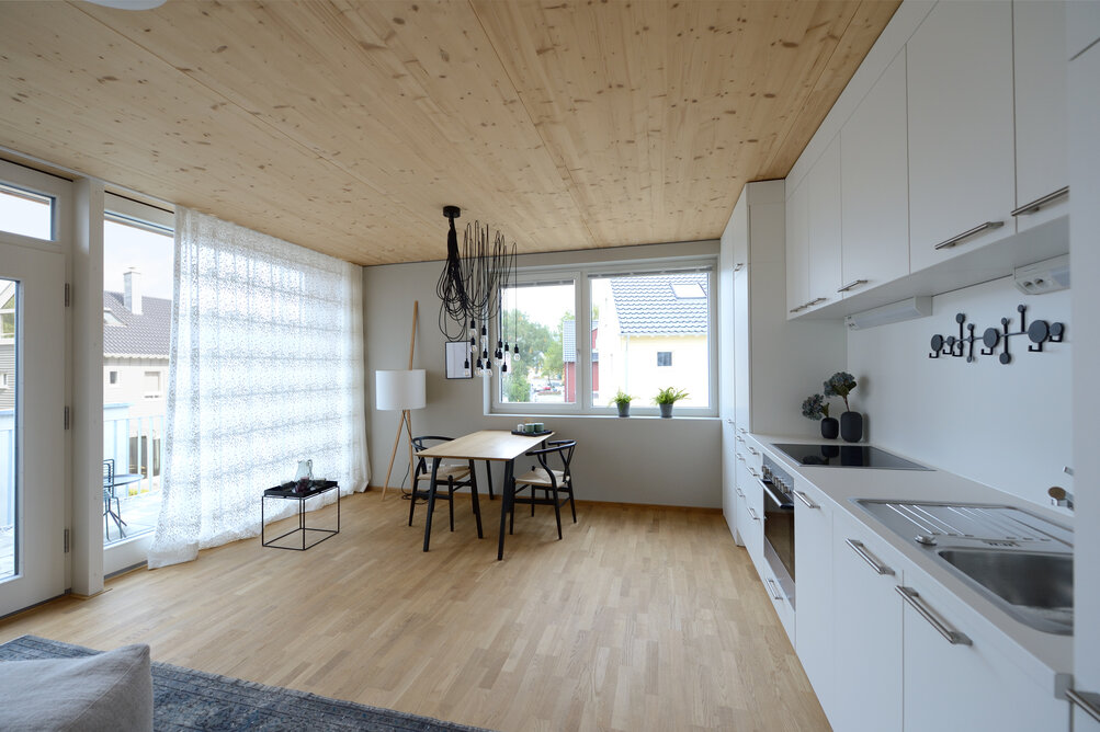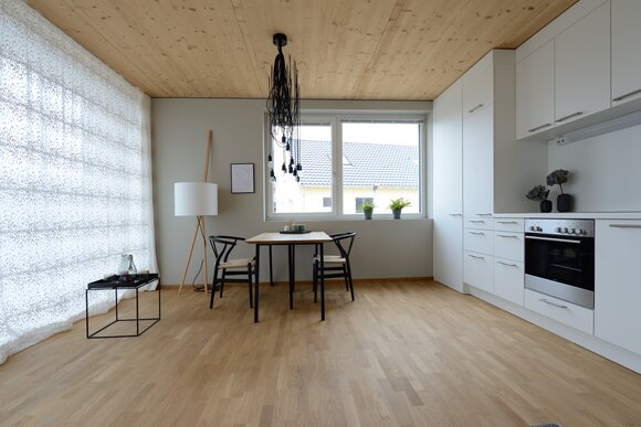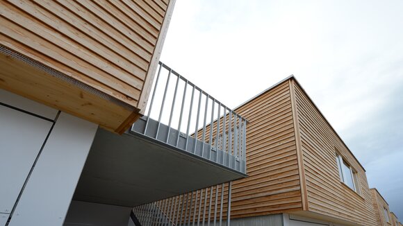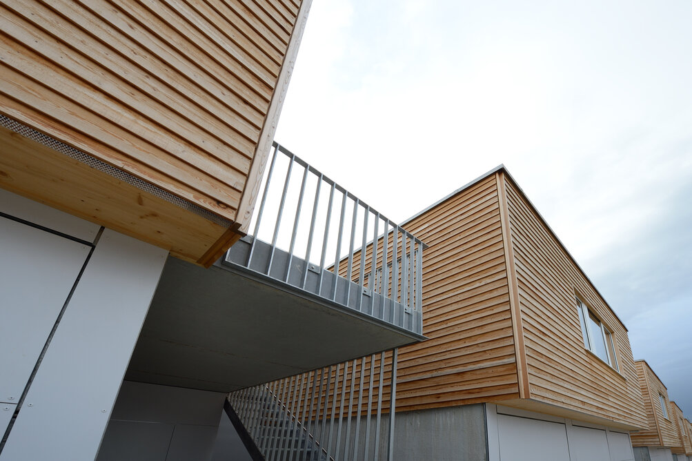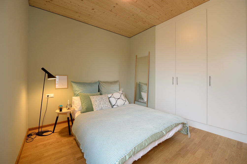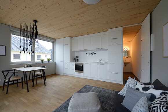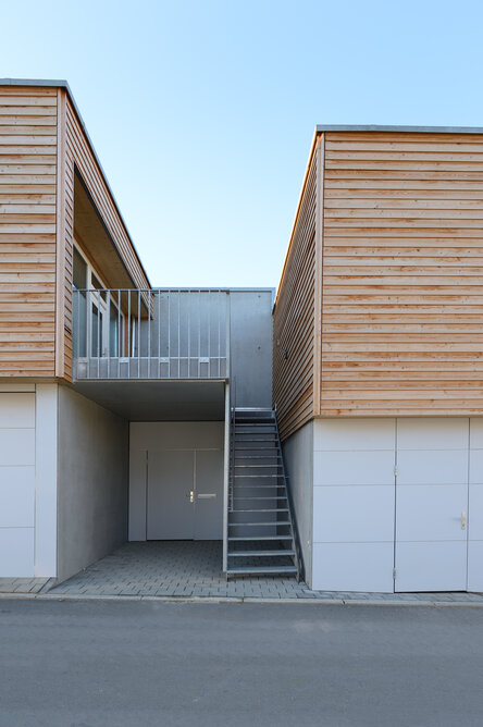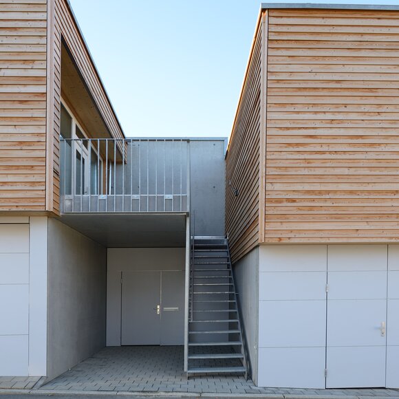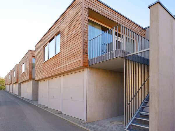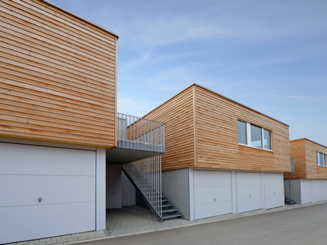 Zur Entwicklung von Quartierskonzepten gehört häufig auch die Planung von Garagen. Warum nicht diese als „Grundstücke“ für die Überbauung nutzen, hat man sich in Reutlingen gefragt. Das sieht besser aus als „nackte“ Garage, verschafft zusätzlichen Wohnraum und dient einer gelungenen Durchmischung des Quartiers. Denn die Wohnungen sind, gerade auch für junge Menschen, in Grundriss und Preis attraktiv. Hier wurde auf sechs Garagenblöcke à drei Garagen je eine Wohnbox aufgestockt. Entstanden sind sechs helle und freundliche Apartments mit offenem Wohn-, Ess- und Kochbereich sowie Bad und Schlafzimmer für je ein bis zwei Personen. Raffiniert: Die Küchenzeile hat links und rechts in die Küchenfront integrierte Türen – rechts gelangt man ins Badezimmer, links ins Schlafzimmer. Durch die geschickte Planung verfügt jedes Apartment über eine private, gepflasterte Terrasse, die von den Nachbarn nicht einsehbar ist. Sie ist jeweils 14,5 qm groß und über eine separate Treppe erschlossen. Außerdem hat jede Wohnbox einen überdachten Eingangsbereich und einen überdachten Abstellbereich, z.B. für ein Fahrrad, der sich unter der Terrasse ergibt.