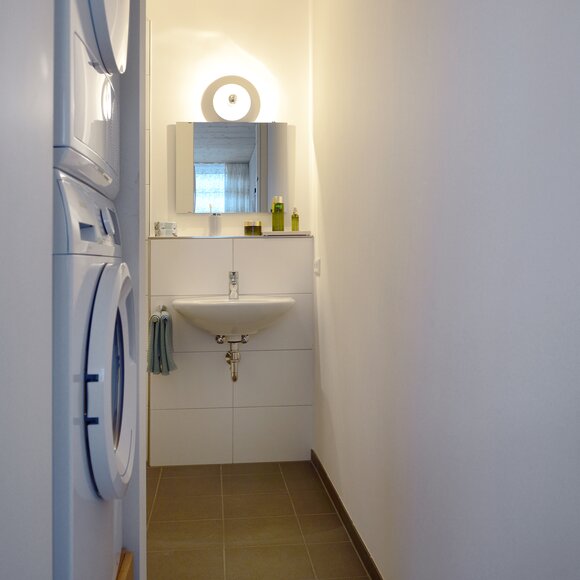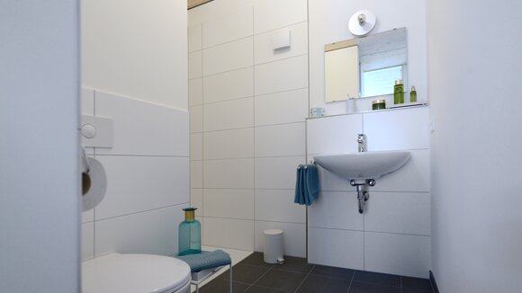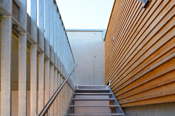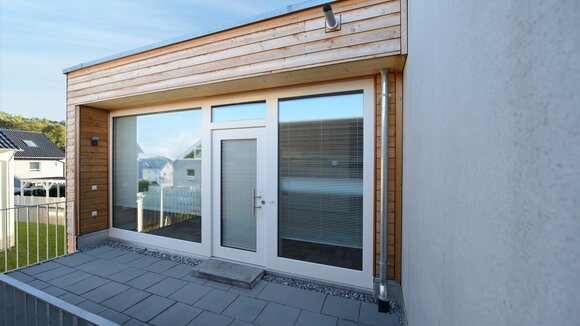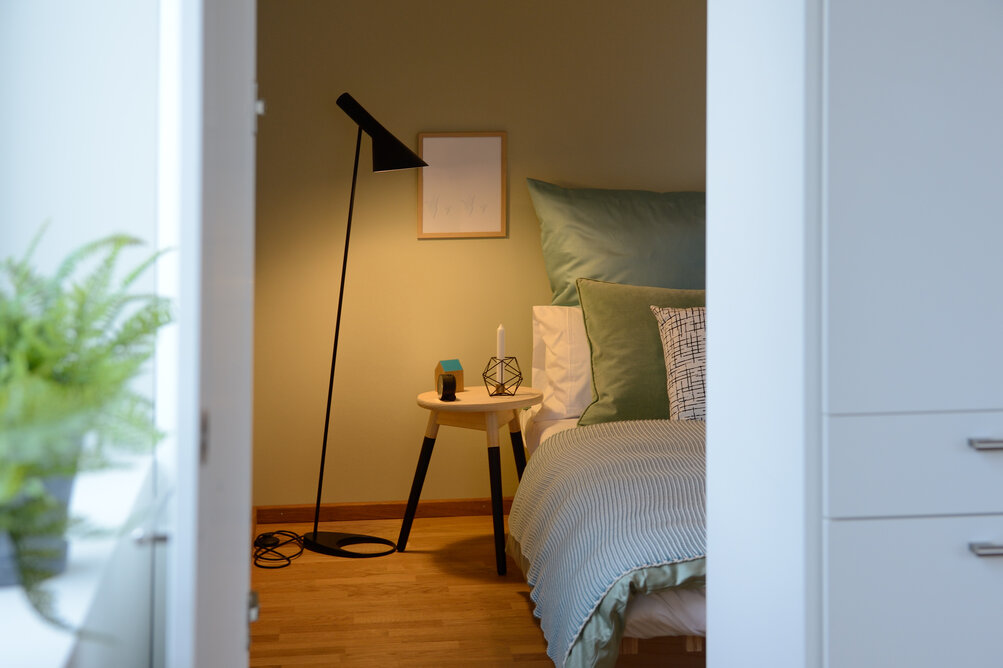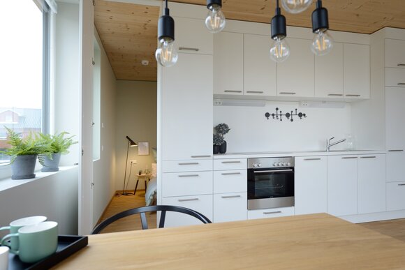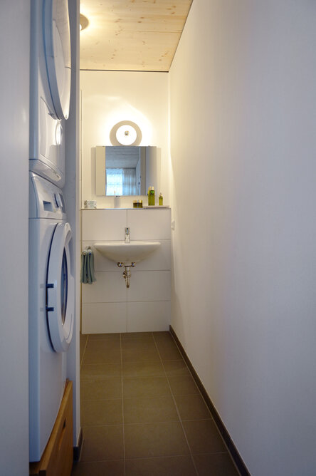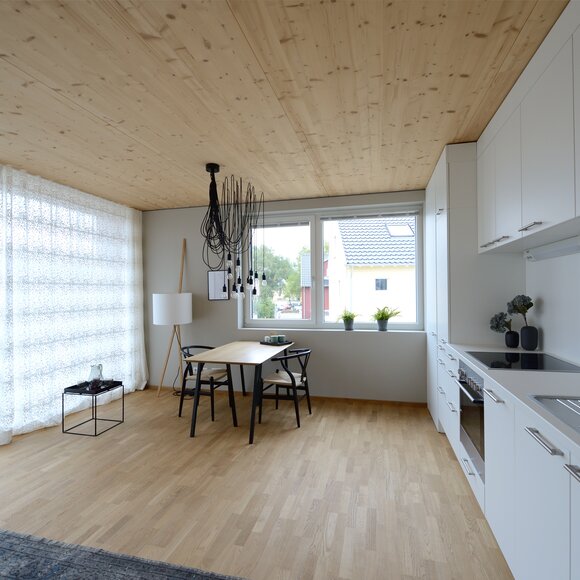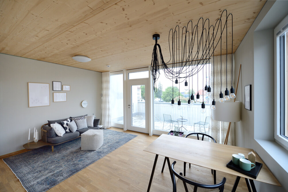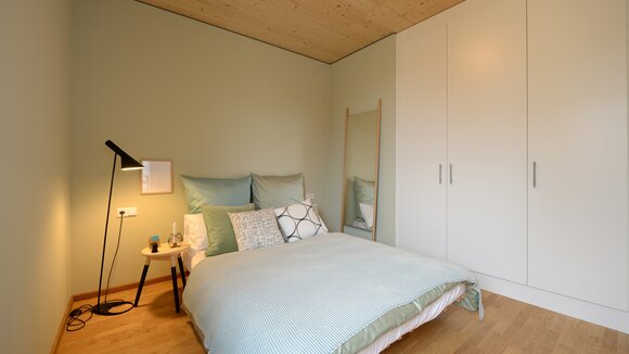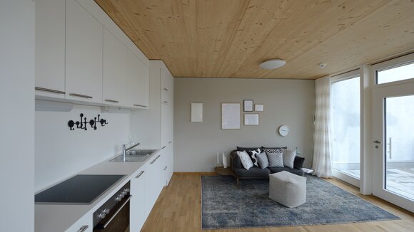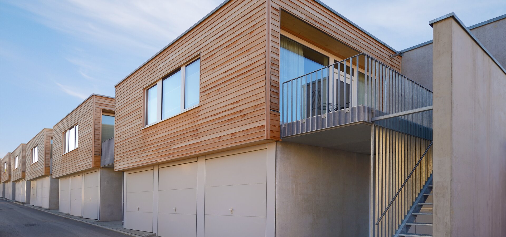 Zur Entwicklung von Quartierskonzepten gehört häufig auch die Planung von Garagen. Warum nicht diese als „Grundstücke“ für die Überbauung nutzen, hat man sich in Reutlingen gefragt. Das sieht besser aus als „nackte“ Garage, verschafft zusätzlichen Wohnraum und dient einer gelungenen Durchmischung des Quartiers. Denn die Wohnungen sind, gerade auch für junge Menschen, in Grundriss und Preis attraktiv. Hier wurde auf sechs Garagenblöcke à drei Garagen je eine Wohnbox aufgestockt. Entstanden sind sechs helle und freundliche Apartments mit offenem Wohn-, Ess- und Kochbereich sowie Bad und Schlafzimmer für je ein bis zwei Personen. Raffiniert: Die Küchenzeile hat links und rechts in die Küchenfront integrierte Türen – rechts gelangt man ins Badezimmer, links ins Schlafzimmer. Durch die geschickte Planung verfügt jedes Apartment über eine private, gepflasterte Terrasse, die von den Nachbarn nicht einsehbar ist. Sie ist jeweils 14,5 qm groß und über eine separate Treppe erschlossen. Außerdem hat jede Wohnbox einen überdachten Eingangsbereich und einen überdachten Abstellbereich, z.B. für ein Fahrrad, der sich unter der Terrasse ergibt.