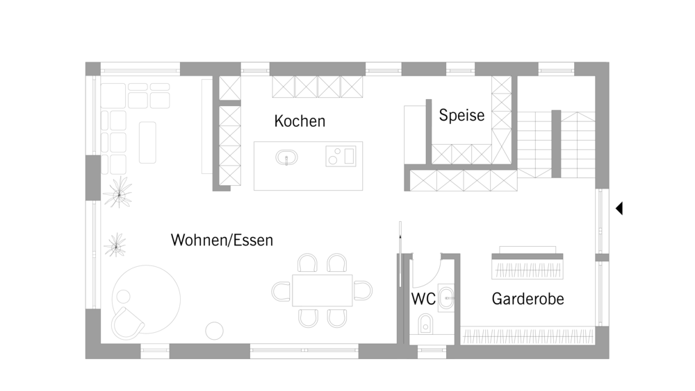 Anders als im früheren Zuhause fallen Familie und Gäste endlich nicht mehr mitten in eine Ansammlung von Gummistiefeln, Turnbeuteln, Taschen und Schulranzen, Jacken und Hundeleinen. Stattdessen gibt es eine große Garderobe, geräumig geplant und mit einem Wandelement von eigentlichen Eingangsbereich getrennt. Sind die Kinder aus dem Haus, kann später hier, neben dem Gäste-WC, auch ein Büro entstehen.