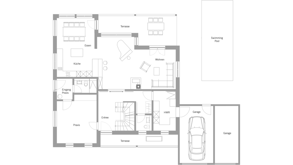 Die Terrasse, die von einem Naturteich in der Flucht des Gartens begrenzt wird, stellt ein weiteres Highlight des Hauses dar. In Verlängerung der Garage haben die Bauherren zudem einen schlichten Garten-Swimmingspool realisiert, der mittels einer Sichtschutzmauer mit eingelassenem Buntglas-Ornament vom östlichen Nachbargrundstück blickgeschützt ist.