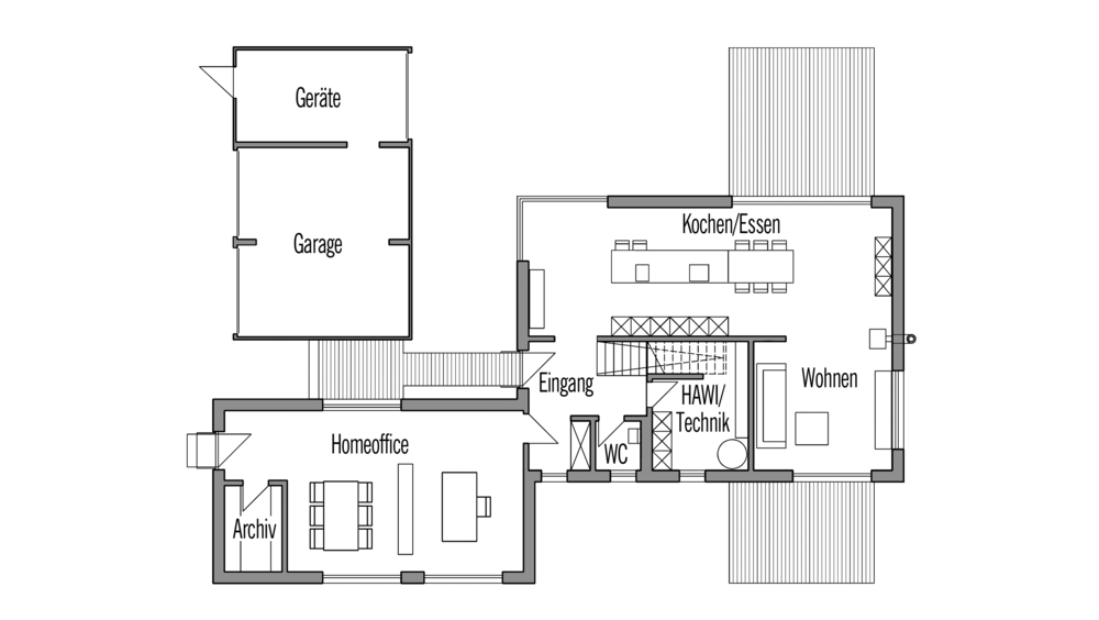 Im Inneren setzt sich das klare Außenkonzept fort. Eine mittig eingezogene Wandscheibe im Erdgeschoss des Haupthauses trennt nicht nur Eingangsbereich, Treppenhaus und Technikraum vom kommunikativen Allraum. Sie ermöglicht auch eine Deckenspannweite von 12 Metern in der offenen Wohnküche. Kochinsel und der sich anschließende Tresen in gleicher Höhe, eine Idee der Bauherrin, betonen die Raumlänge. Vier Schirmleuchten und die Trennwand in Anthrazit unterstreichen sie zusätzlich. „Familie und Freunde sitzen am liebsten auf den Barhockern, die Kinder spielen lieber im Wohnzimmer", erzählt die Bauherrin. Die Geradlinigkeit der Architektur akzentuiert sie mit ihrer puristischen Einrichtung. Trotzdem wirkt das Erdgeschoss freundlich: Eichenholzdielen erden und wärmen überall. Eine einläufige Treppe führt ins Obergeschoss. Um den zentralen Flur mit wenig Verkehrsflächen gruppieren sich Kinder- und Gästezimmer, zwei Bäder, Abstellraum und das Elternschlafzimmer mit separater Ankleide.