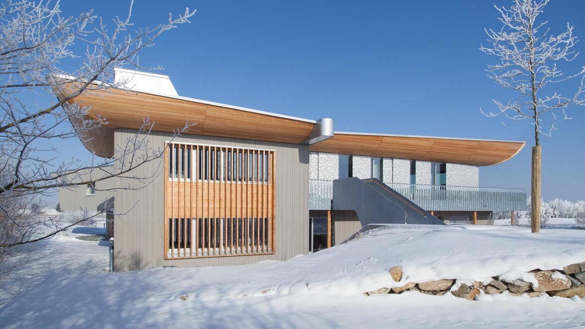 Inspiriert vom Schiffbau als ureigener Form des Holzbaus, entwarf man die bugartigen Dachformen mit Schwingungen und Bögen; organische Formen, wie sie in der Natur vorkommen