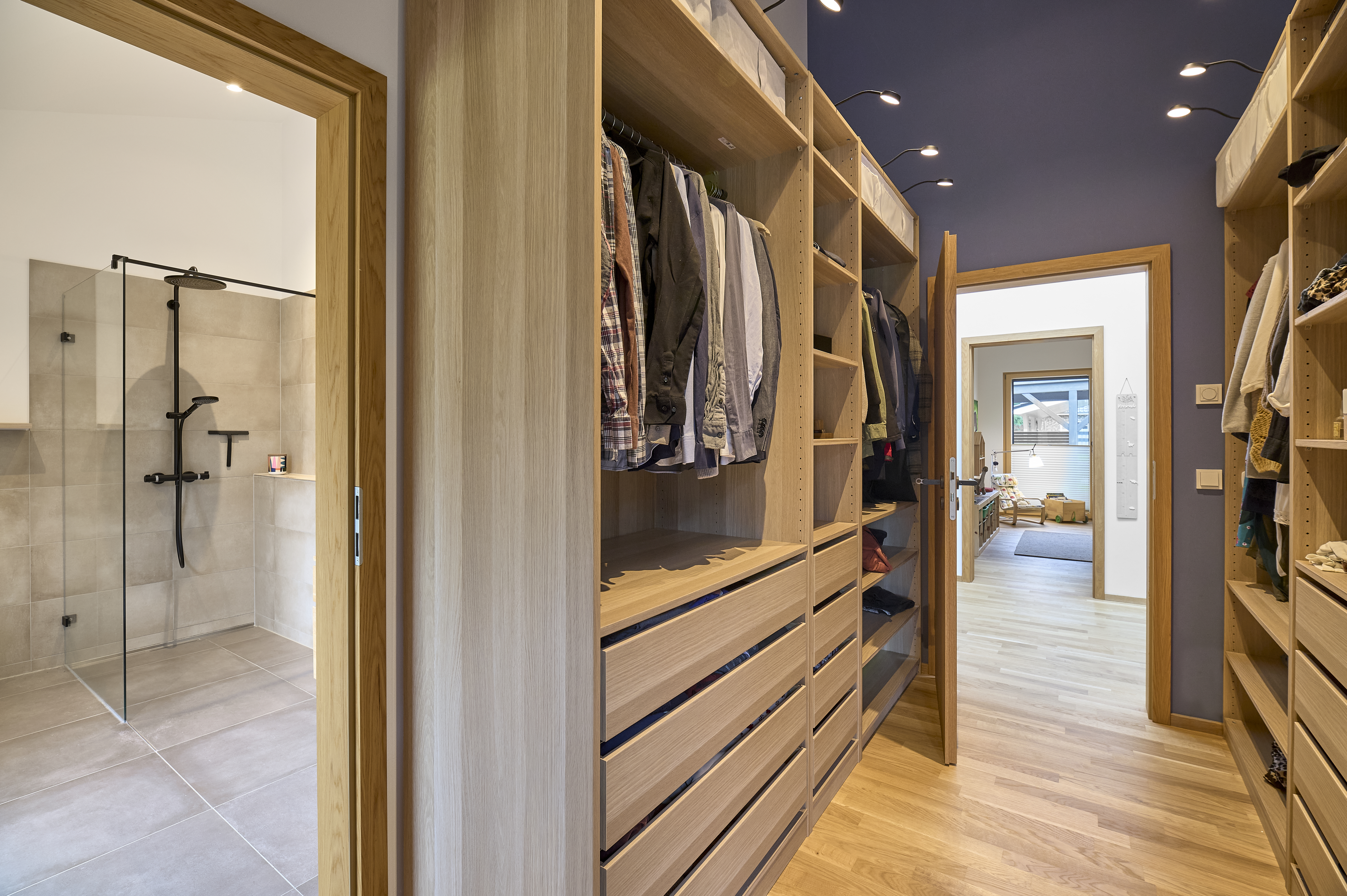 Von außen zurückhaltend, eröffnet sich der Bungalow innen weitläufig, einladend offen bis unters Dach, im Wohnbereich mit Nut- und Federschalung in Weißtanne, und dank der Dachverglasung des Oberlichts herrlich hell. Breit angelegt, führt der Flur rechts zu den Schlafzimmern, Bad und Yogaraum. Geradeaus, im linken Teil des Hauses also, befinden sich WC, Haustechnik, Speiseraum, Büro, Kochen und Essen sowie der Wohnbereich.