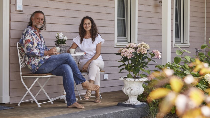 Gestalterisch wurde das Domizil ganz nach den Vorstellungen und Wünschen der Bauherren im New England-Look gestaltet. Seinen besonderen Charakter unterstreicht die Landhaus-typische Holzfassade in Schlammfarben und creme-farbenen Akzenten, die in Kombination mit den Dachgiebeln und verspielt-romantischen Rundbogenfenstern den amerikanischen Charme nach Außen tragen. Auch aufwendige Architekturdetails, wie die Fenster im Vintage-Look mit innenliegenden Sprossen oder die überdachte Veranda zur Gartenseite hin, vollenden das Stilbild.