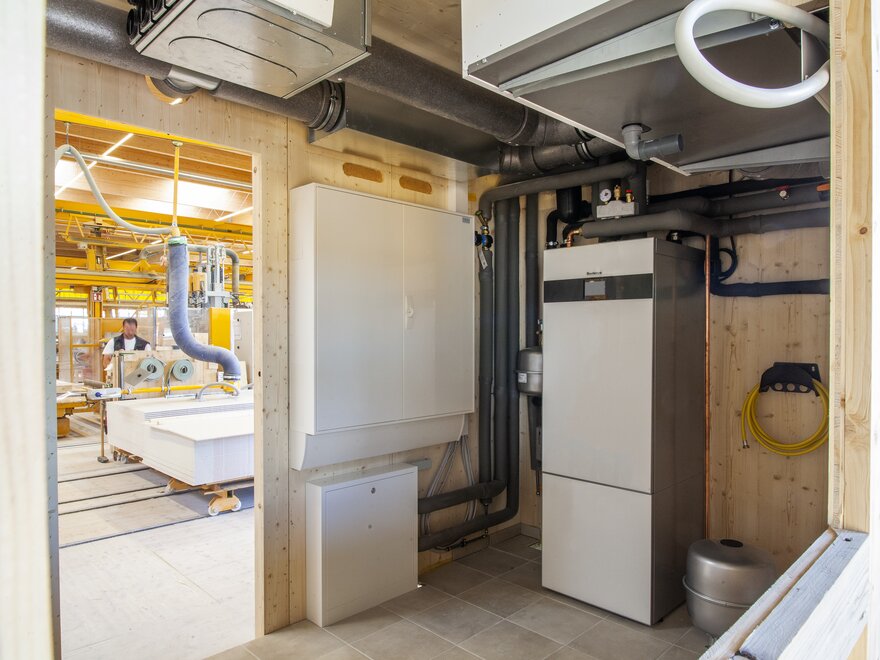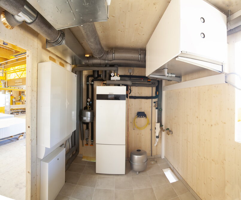 Die Platzierung und Montage auf der Baustelle vor Ort kann schnell, reibungslos und absolut exakt erfolgen. Mit enormen Vorteilen für Baufritz-Bauherren: Die komplett digitale Vorplanung und akkurate Vorproduktion sparen im Bauverlauf eine ganze Woche Arbeitszeit. Alle Komponenten sind erstaunlich platzsparend angeordnet, auf geringstmöglichem Raum. Der Technikraum wird nur noch auf die Bodenplatte oder den Keller gesetzt, angeschlossen und ist sofort einsatzbereit. Montieren, verbinden – und Wärme kann einziehen …