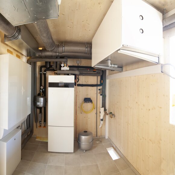 Ein Technikraum, der fix und fertig vorbereitet auf der Baustelle ankommt – und vor Ort innerhalb kurzer Zeit installiert wird, das ist das Energie-Wände-Modul, eine technische Innovation von Baufritz. Komprimiert auf wenigen Quadratmetern, bietet es große Vorteile. Bei Effizienz, Flächennutzung und Service. Sogar ein Hauswirtschaftsraum hat hier Platz. Und: Die Haustechnik ist direkt einsatzbereit …