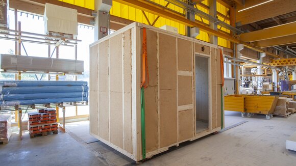 In allen Details digital geplant und in unserer Manufaktur exakt vorproduziert, wird das Energie-Wände-Modul sorgfältig verpackt, bevor es auf die Reise zur Baustelle geht. Vor Ort platzieren unsere Monteure den Technikraum direkt an der richtigen Stelle und übernehmen die fachgerechte Installation.
