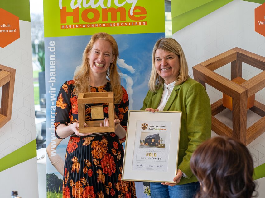 Gold in der Kategorie Ökologie - mit dieser höchsten Auszeichnung hat der Family Home Verlag unser Musterhaus "my smart green home: Schwarzwald" im Rahmen der Wahl zum Haus des Jahres anerkannt. Anlässlich der feierlichen Preisverleihung im Landtag von Stuttgart konnte unsere Geschäftsführerin Dagmar Fritz-Kramer die Urkunde aus der Hand von Chefredakteurin Monika Läufle in Empfang nehmen. Auf dem Markt der Fertighaushersteller werden wir mit "my smart green home: Schwarzwald" sehr positiv als bauliche Ausnahmeerscheinung wahrgenommen. Das monolithisch wirkende Haus mit der modernen Fassade in Holz, zu sehen in der FertighausWelt Schwarzwald, der Musterhausausstellung nahe Freiburg, entspricht dem Wunsch vieler Menschen an ein architektonisch einzigartiges Haus, das dank des neuartigen digitalen Baufritz-Konfigurators vom Bauherrn entsprechend dem eigenen Budget mit geplant werden kann. Darüber hinaus verfügt das mit Gold prämierte Sieger-Haus über das innovative Energie-Wände-Modul, die hauseigene Entwicklung von Baufritz. In diesem Technikraum wird Haustechnik auf kleinem Raum konzentriert, in einem Stück an der Baustelle angeliefert, vor Ort direkt an der richtigen Stelle platziert und angeschlossen. Wichtiges Kriterium für die Jury, BDF-Geschäftsführer Achim Hannott, Chefredakteurin Monika Läufle und Verlagsleiter Klaus Vetterle, war die Verwendung ressourcenschonender, nachwachsender Rohstoffe. Zudem sollen Herstellung und Verarbeitung möglichst wenig graue Energie verursachen und Baustoffe sich recyceln lassen. Das erfüllen wir von Baufritz aus Sicht der Juroren in vorbildlicher Weise, zumal ausschließlich schadstoffarme Materialien verbaut werden. Anerkannt wurde darüber hinaus, dass wir damit als erstes Unternehmen in Deutschland das Qualitätssiegel Nachhaltiges Gebäude „QNG PREMIUM“ (BNK) für ein Wohngebäude erhalten haben.