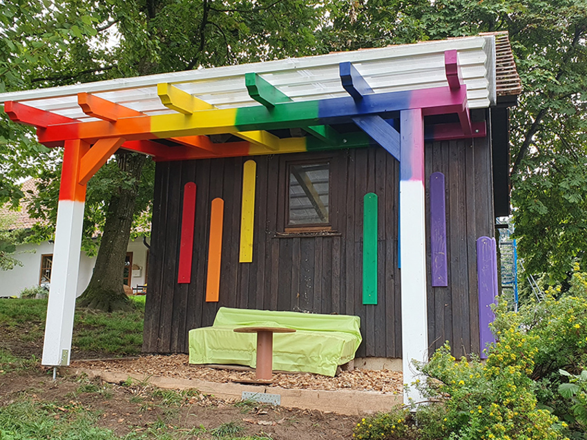 Die Kinder und das Personal sowie der Elternbeirat des Kindergartens Ronsberg freuen sich über die gelungene Überdachung. Nach der Fertigstellung wurden die Holzbalken mit bunter Farbe bemalt und fügen sich damit gelungen in das Außengelände des Kindergartens ein. Wir freuen uns, dass wir mit der Holzspende zu diesem gelungenen Projekt beitragen durften.