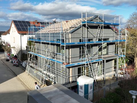 Eine beliebte Stadt im Süden Deutschlands, begehrte Wohnlage, knappe Fläche, begrenztes Budget – Nachverdichtung ist das Stichwort, wenn man dennoch bauen und in der gewohnten Gegend bleiben will. Baufritz baut das gesündeste Haus mit dem kleinsten CO2-Fußabdruck, das hatte sich die Bauherrenfamilie gemerkt, als sie mit uns Kontakt aufnahm. Dass die Nachbarschaft aufmerksam beobachten würde, was da in der unmittelbaren Umgebung passiert, war klar. Zumal die Anforderungen und Vorgaben beim Bauen im Bestand an sich schon vergleichsweise hoch sind. Die Entscheidung konnte also mit dem Versprechen der sauberen Baustelle nur auf unsere perfektionierte Holztafelbauweise fallen. Schließlich werden die Elemente bereits in der Manufaktur vorgefertigt, logisch und gut verpackt in Etappen an der Baustelle angeliefert und von unseren Monteuren schnell und routiniert verbaut. Die Bauzeit ist im Vergleich zum Massivbau deutlich kürzer, das Raumklima im Holzbau nachhaltig gesund. Die Belastung für die Nachbarn in der gewachsenen Wohnumgebung? Äußerst gering. Die Wohnqualität? Maximal. Wie schnell das neue Eigenheim steht? Das zeigt der Film … Und auch die schnelle Antragstellung kann entscheidend sein – um Fördermittel aus dem Programm „Klimafreundlicher Neubau“ (KFN) in Anspruch zu nehmen.