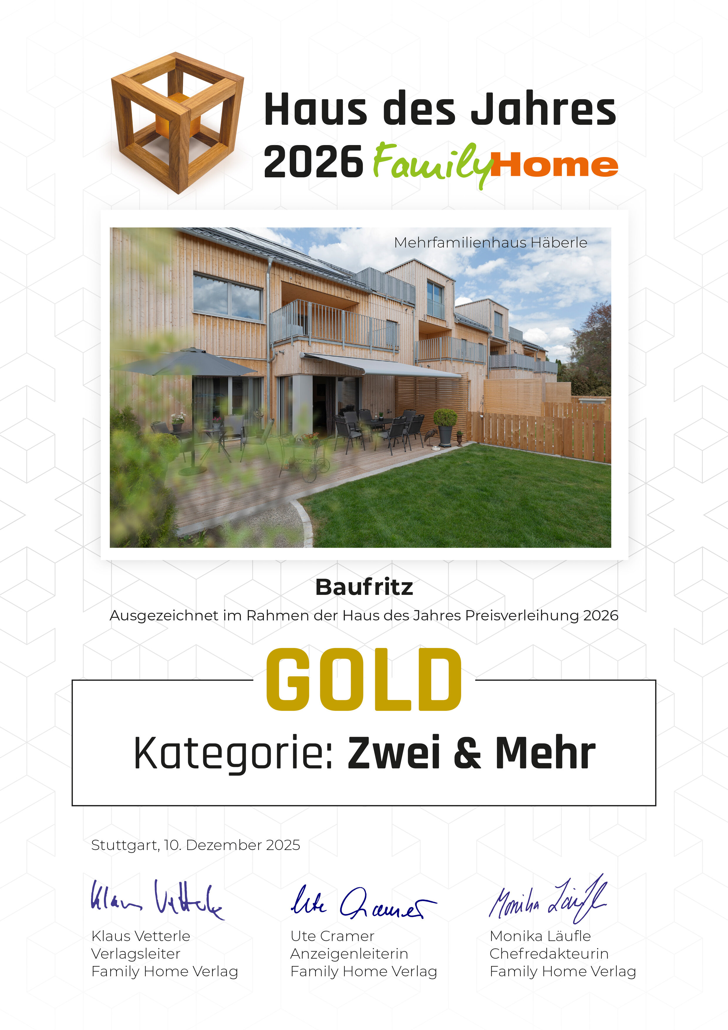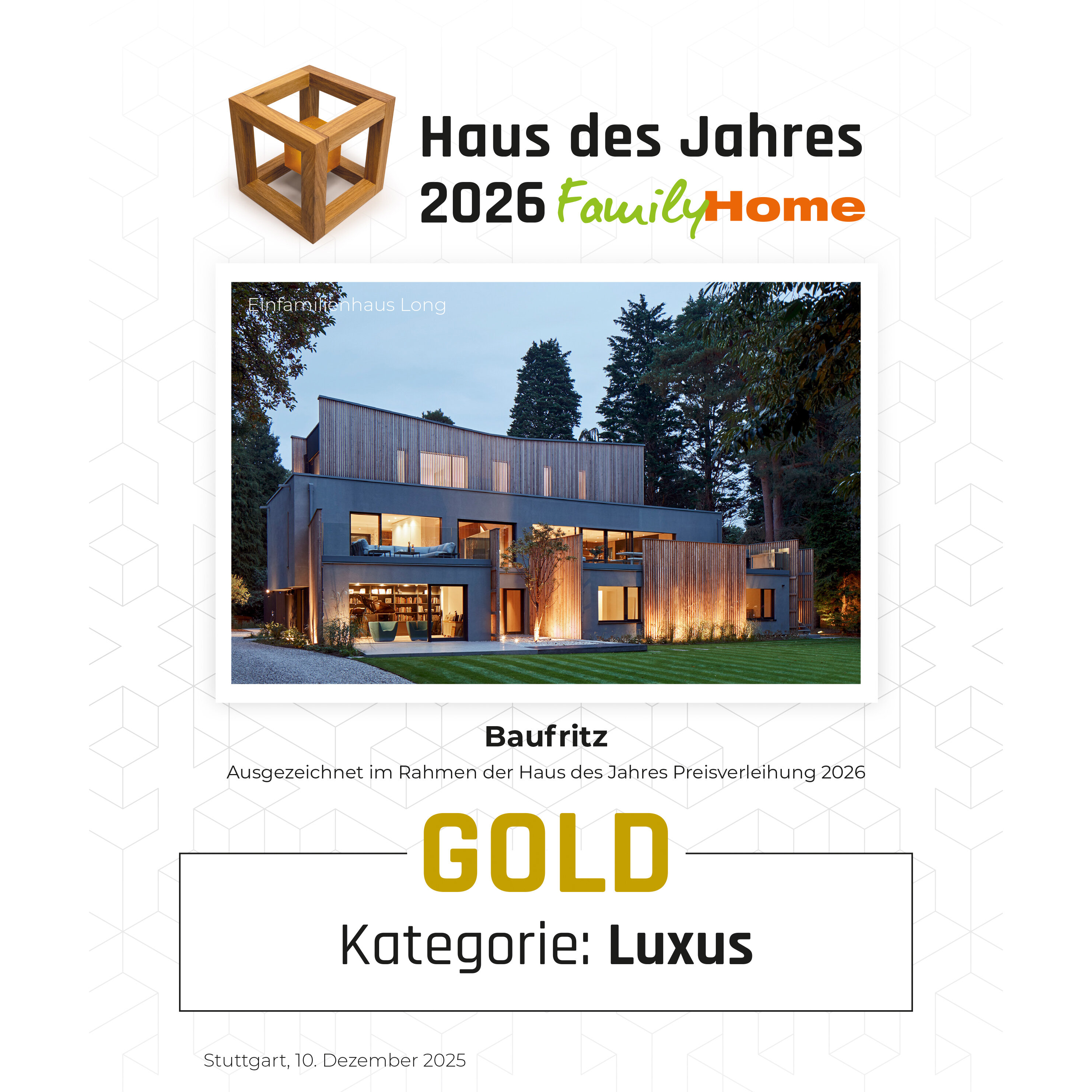 In der Kategorie „Luxus“ überzeugte unser Haus Long, während wir in der Kategorie „Zwei & Mehr“ mit unserem Mehrfamilienhaus Häberle den Spitzenplatz erreichten.