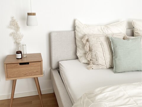 Im Untergeschoss findet man das Schlafzimmer, das wie der Rest des Hauses im stilvollen Skandi-Stil mit natürlichen Materialien, weißen Möbeln und viel Eiche eingerichtet ist. Das Zusammenspiel dieser Elemente schafft eine harmonische Atmosphäre. Die angrenzende Ankleide bietet ausreichend Platz für Kleidung und schafft eine geordnete und aufgeräumte Umgebung. Das Musikzimmer ist ein besonderer Rückzugsort für Elena, die dort ihre Leidenschaft für das Klavierspielen ausleben kann.