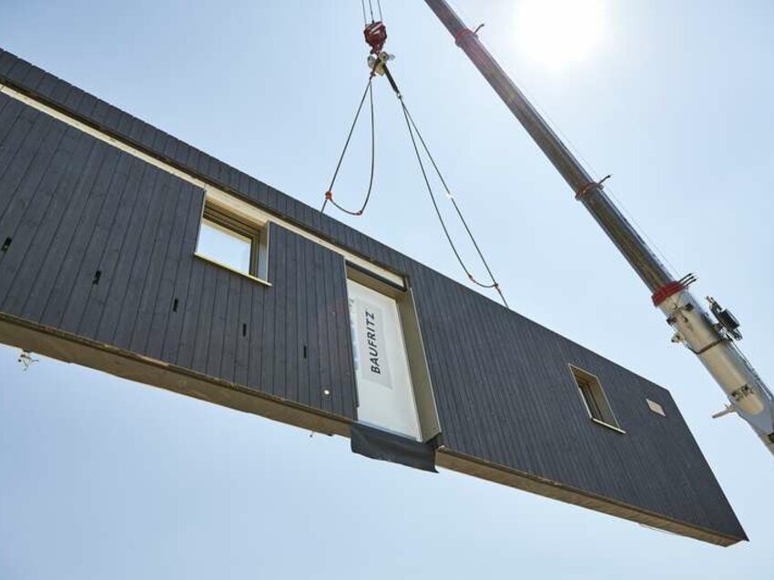 Erleben Sie hautnah, wie ein Baufritz-Einfamilienhaus entsteht! Seien Sie live dabei, wenn die vorgefertigten Wand-, Decken- und Dachelemente aus unserer Manufaktur innerhalb kürzester Zeit zu einem nahezu fertiggestellten Haus zusammengefügt werden.