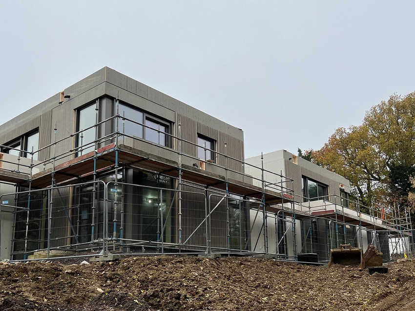 Thanks to the outstanding work our fabulous team, the house was prefabricated, delivered and assembled in record time. A total of 28 fully loaded lorries transported the prefabricated elements from Germany to the building site in the UK, making 56 round trips from the transshipment point. The waterproof shell was put together over the course of just nine working days and is now ready to be fitted out.