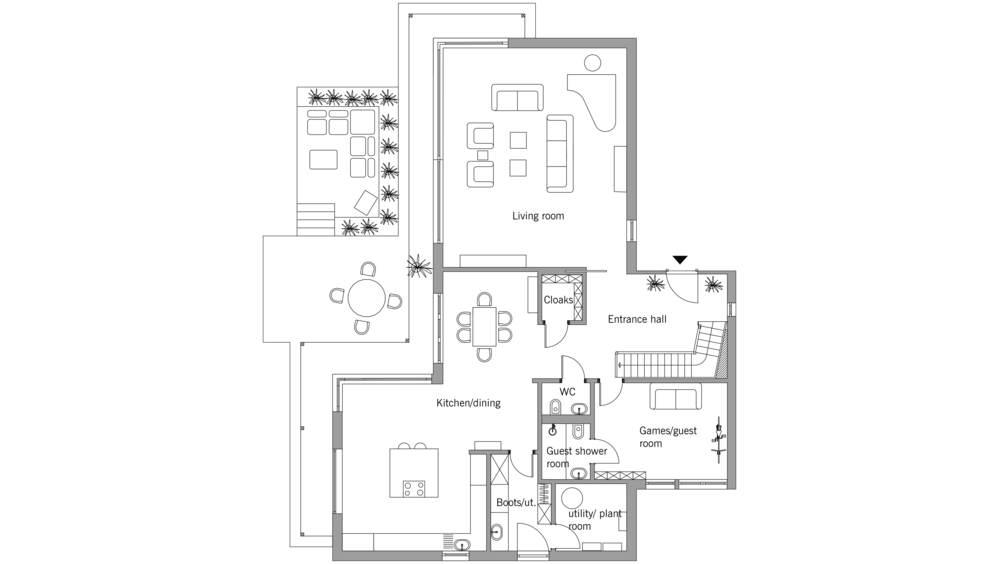 Photovoltaic panels have been installed on the south-facing roof of the main volume of the house. This has an optimum pitch of 28 degrees for generating electricity from the sun. The PV panels, which are black to reduce their visual impact, are connected to the national grid and produce most of the electricity needed to run the house.
