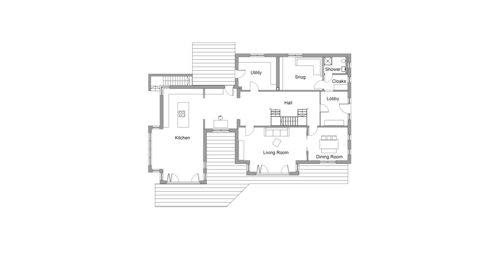 "Featuring natural stone, traditional timber cladding and oyster-white render finish, the façade of this exclusive family home combines traditional and modern materials. The large windows open onto the sea and the sourrounding woodlands. A seperate one-bedroom flat in the basement provides space for multigeneration living."