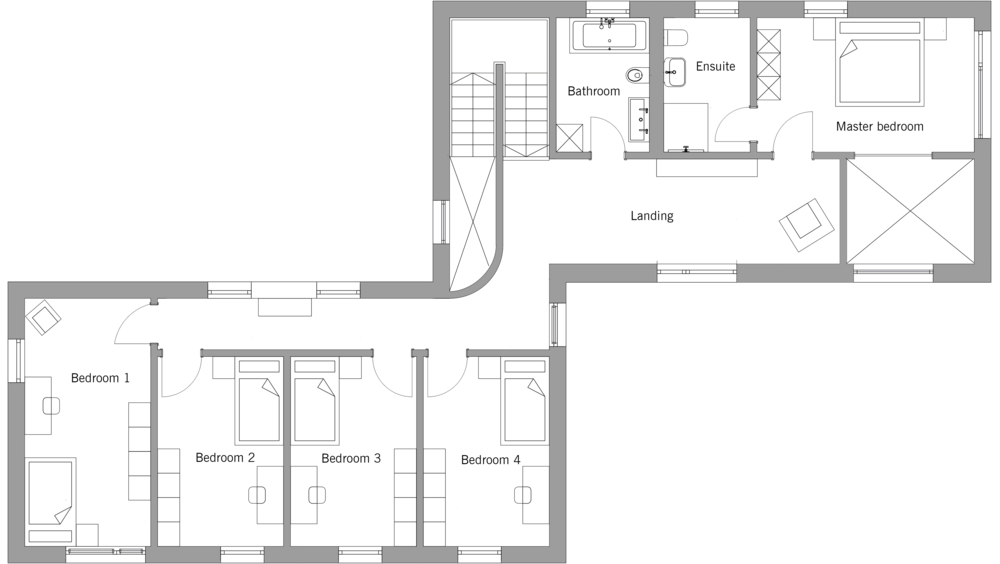 "The house is set on a north-west to south-east axis. Large windows in the habitable rooms offer views of the garden with mature trees and the surrounding countryside."