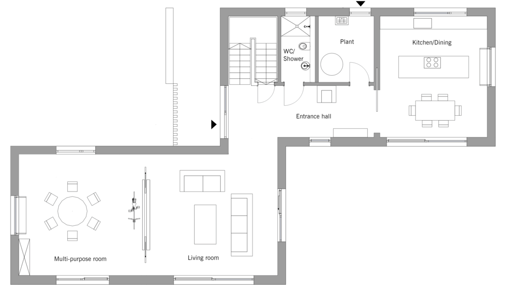 The double-height ceiling over the dining table creates a feeling of space with an interplay of light. The house has been designed so that that the rooms in which the family lives are facing south-west, with large windows to make the most of the views of the woodlands and surrounding nature. The functional rooms to the north-east are more private and have smaller windows.