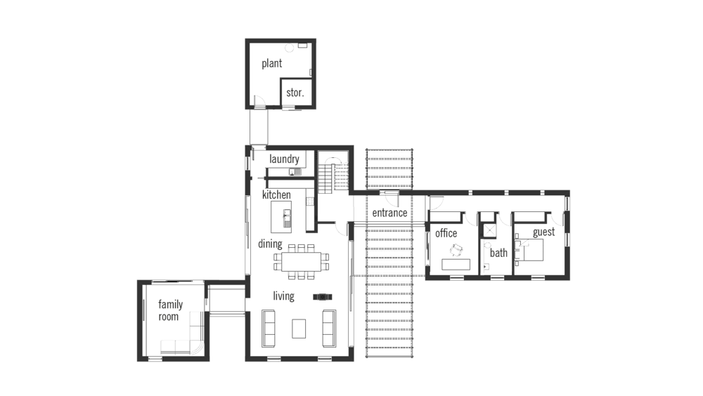 "The Russells' house combines efficiency with comfort. The large living room arranged around the kitchen is big enough for the entire family. The modern Bauhaus style and corresponding interiors offer plenty of light while creating a feeling of space. In addition, the large, floor-to-ceiling windows let the warmth of the sun into the house in the winter, while the venetian blinds keep the rooms cool in the summer."