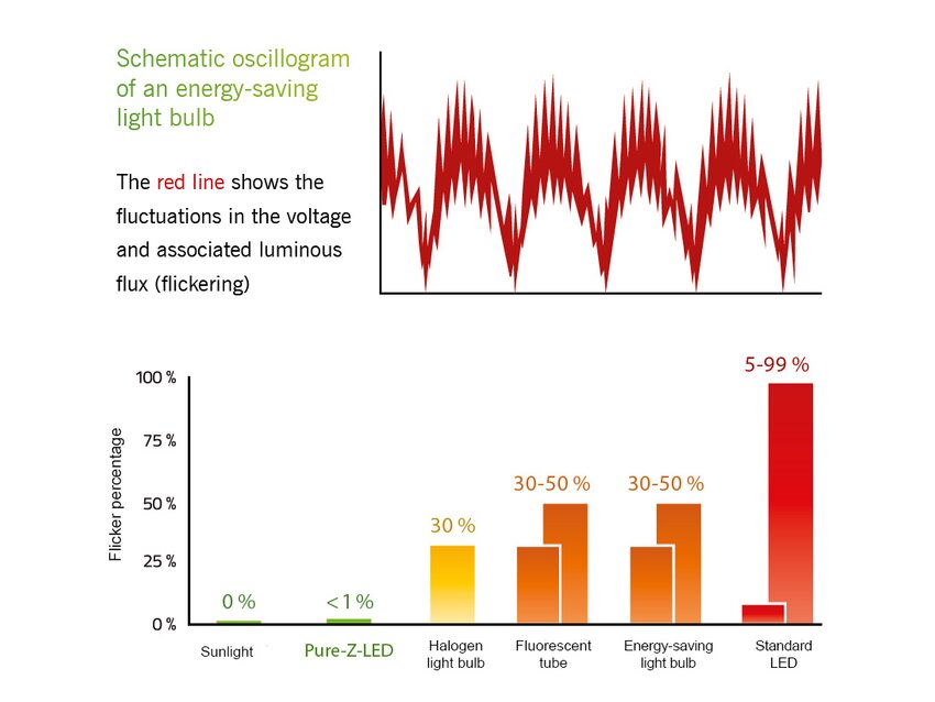 A lot can be said for the sun: It provides us with warmth, quality of life and energy, strengthens our bones and lifts our mood. It helps our body produce vitamins and hormones, governs our sleep-wake cycle as well as our melatonin levels – the hormone responsible for staving off cancer. So why do so many people use artificial lamps? Because the light from the sun is often not enough to reach into the corners of our living spaces. The lighting in our Baufritz houses is modelled on the spectrum of daylight. Pure-Z is a lighting concept that emulates the natural glow of the sun. Because we know that synthetic light, and above all the high share of blue luminescence in fluorescent tubes, energy-saving lamps and many LED lights can have a negative effect on our health, whether we are aware of it or not.